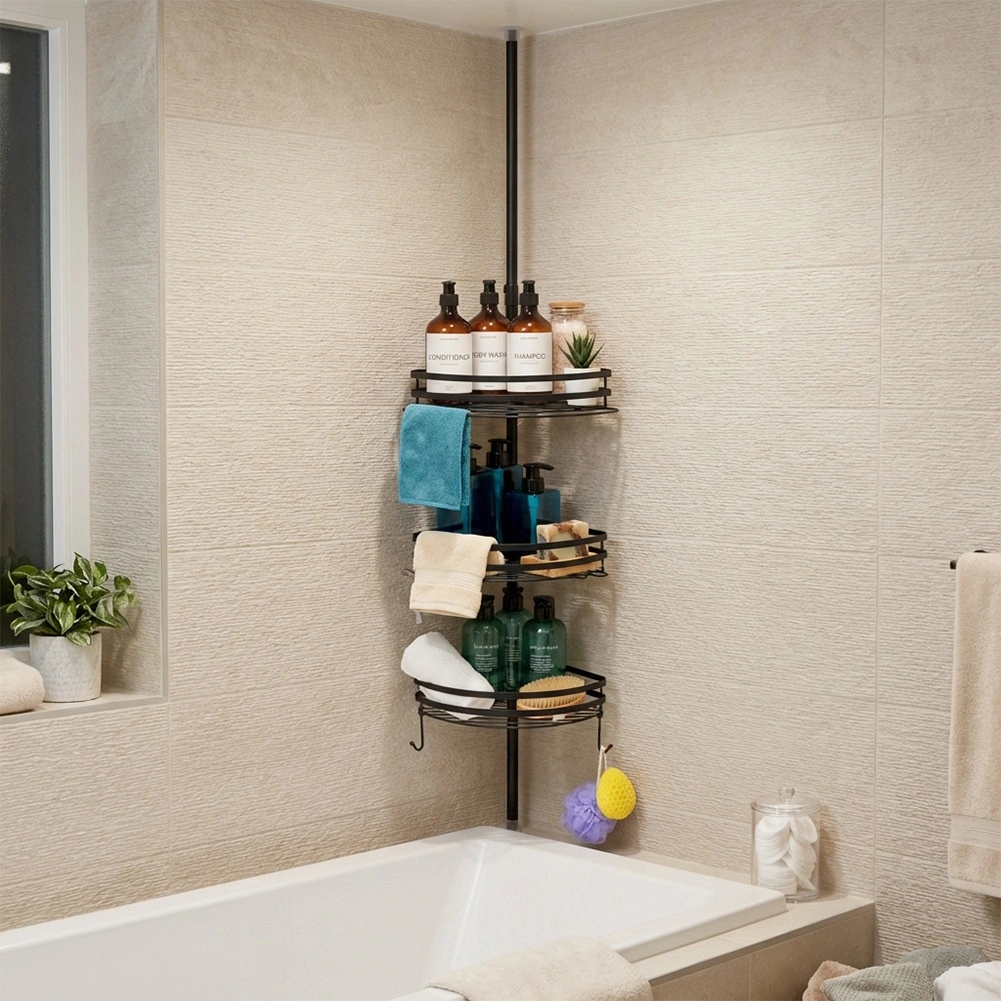 Ułóż swoją łazienkę stylowo i funkcjonalnie. Ta narożna półka prysznicowa z drążkiem teleskopowym montowana jest bez wiercenia – wystarczy rozpierać ją między podłogą a sufitem. Regulowana wysokość pozwala precyzyjnie dopasować rozmieszczenie półek do Twojej kabiny prysznicowej lub łazienki, a matowe czarne metalowe wykończenie nadaje nowoczesny wygląd i zapewnia długą żywotność.