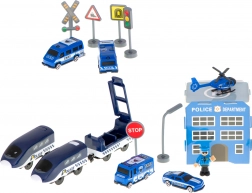 Stacja policyjna z lądowiskiem, 4 różne pojazdy, helikopter, figurka policjanta i znaki drogowe – wszystko do realistycznych akcji i nauki zasad ruchu drogowego.