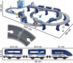 Ta szczegółowo wykonana policyjna kolejka łączy ulubione światy dzieci – pociągi, auta, helikoptery i policję. Dzięki bogatemu zestawowi elementów zbudujesz aż 6 różnych wariantów torów, w tym dwupoziomowe prowadzenie, most i tunel. Magnetyczne złącza wagonów ułatwiają obsługę, a lokomotywa z napędem zapewnia płynną jazdę.