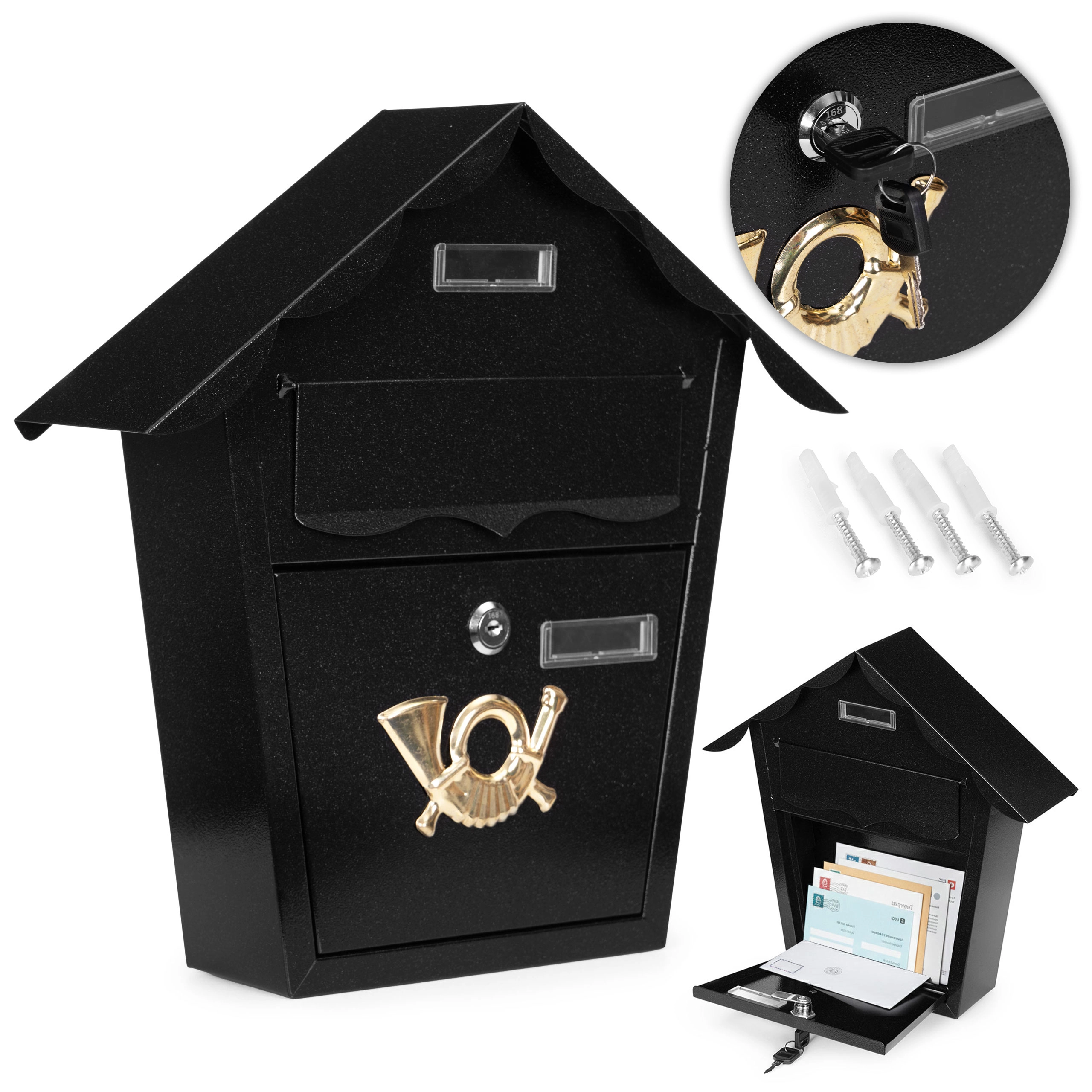 Przemyślane detale ułatwiają codzienne użytkowanie: szerokie drzwiczki dla wygodnego wyjmowania poczty, przezroczyste okienka do szybkiej kontroli zawartości oraz zamek z dwoma kluczami dla bezpiecznego przechowywania. Montaż jest szybki i stabilny – w zestawie znajdziesz 4 śruby i 4 kołki do mocowania na ścianie lub ogrodzeniu.