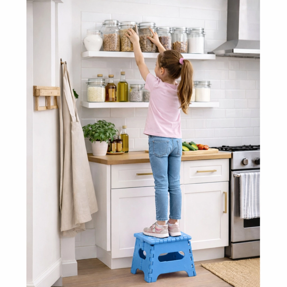 Składany podnóżek z wytrzymałego plastiku zapewnia szybkie podwyższenie przy sięganiu na wyższe półki, przy umywalce lub jako awaryjne siedzisko. Antypoślizgowe kropki na górnej powierzchni oraz stabilne nogi gwarantują bezpieczne użytkowanie także w wilgotnych warunkach.