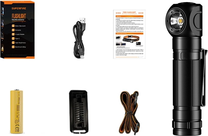 - Latarka, kabel USB-C, akumulator 18650, uchwyt do latarki, opaska na głowę, instrukcja użytkownika, opakowanie