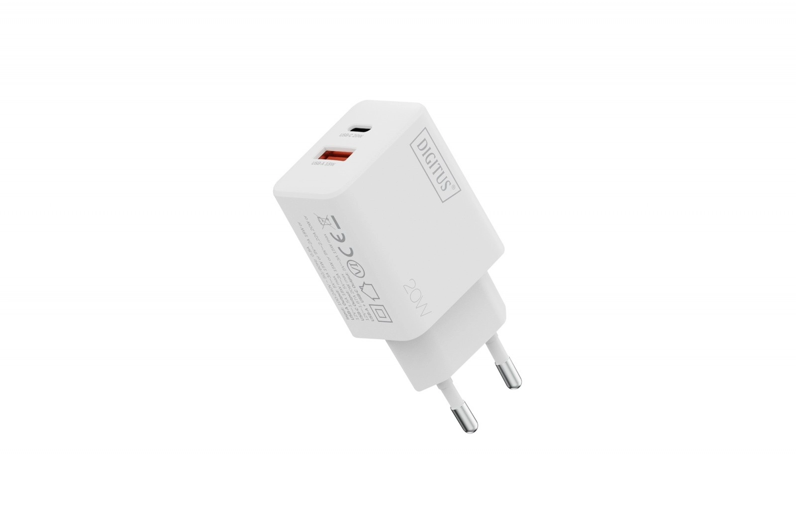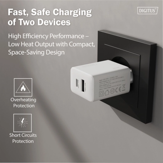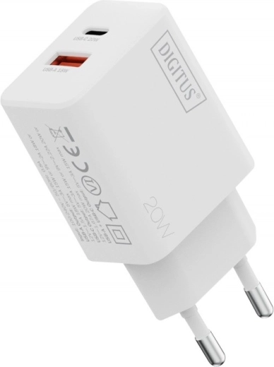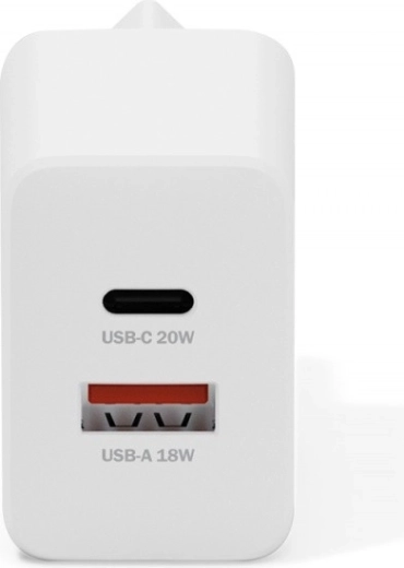 Uniwersalna ładowarka sieciowa z portami USB‑C i USB‑A zapewnia szybkie i niezawodne zasilanie smartfonów, tabletów, bezprzewodowych słuchawek i innych urządzeń. Przy pojedynczym użyciu portów osiąga do 20 W (USB‑C) i 18 W (USB‑A), a przy równoległym ładowaniu oferuje łącznie do 15 W, więc wygodnie naładujesz telefon i słuchawki jednocześnie.
