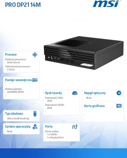 MSI PRO DP21 14M to kompaktowy i wydajny mini komputer do efektywnej pracy w biurze i w domu. Oferuje Intel Core i5-14400, obsługę DDR5 do 64 GB, elastyczne opcje pamięci masowej (M.2 + 2× 2,5"), nowoczesną łączność Wi‑Fi 6E, Bluetooth 5.3 oraz szeroki zakres portów, w tym USB‑C, HDMI i DisplayPort. Dostarczany bez systemu, RAM i pamięci masowej dla pełnej możliwości konfiguracji.