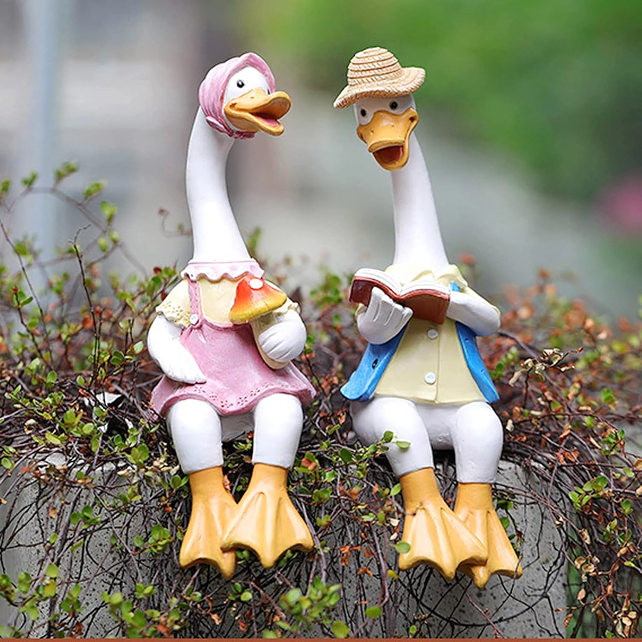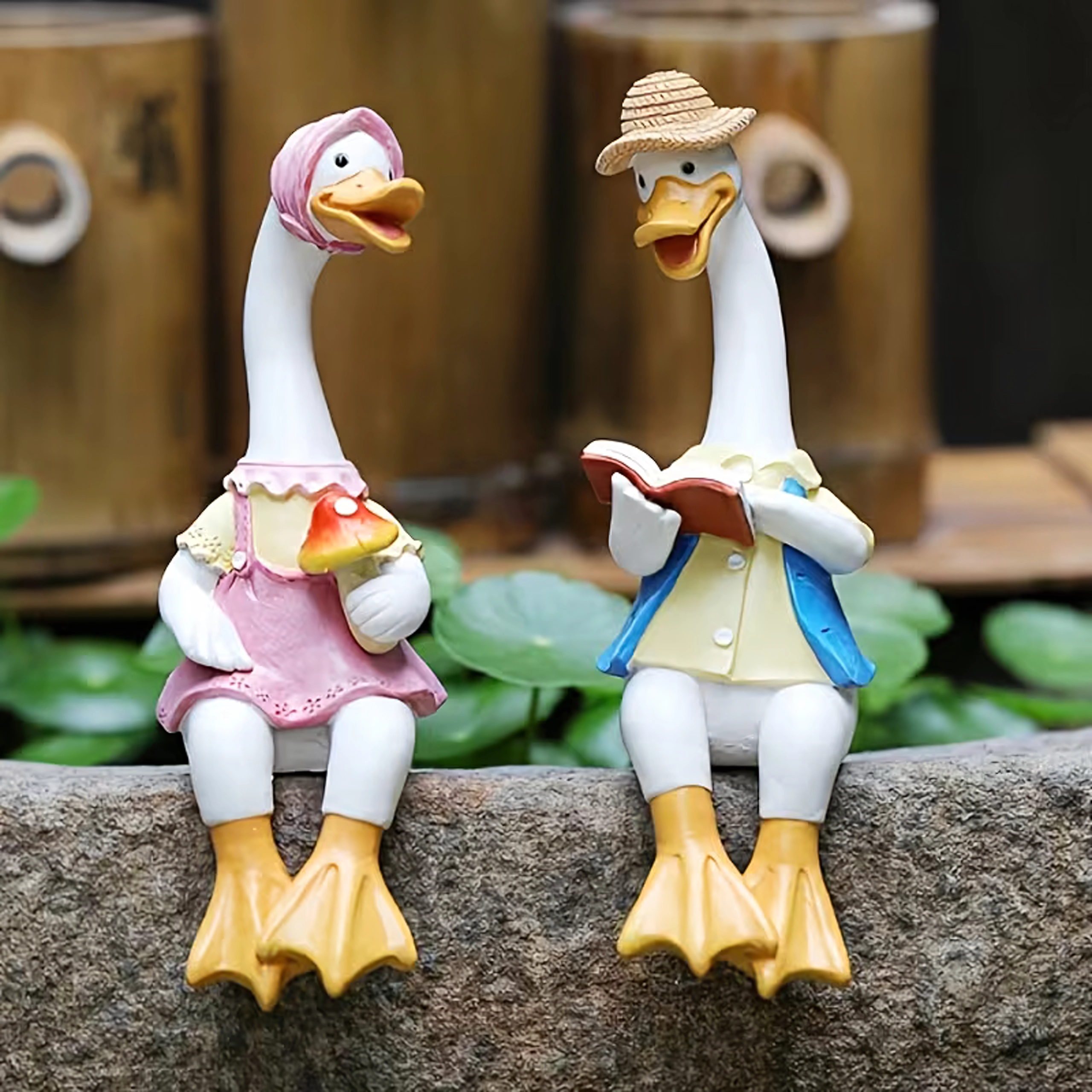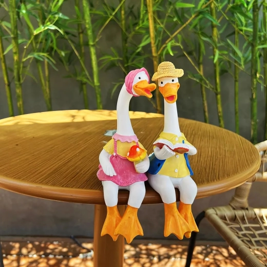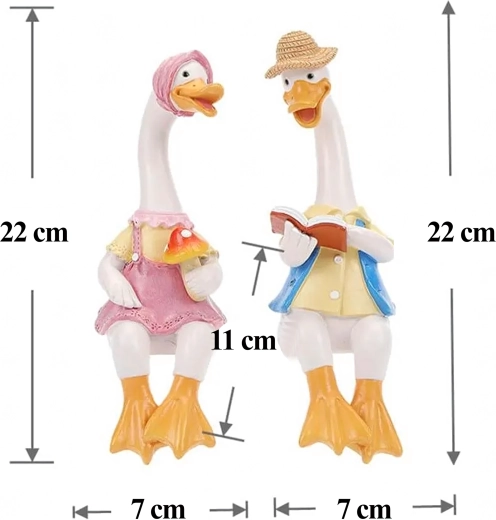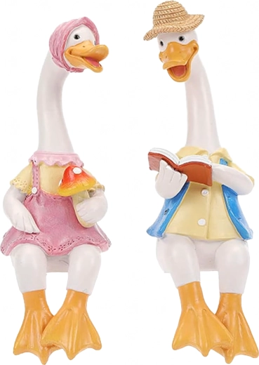 Zestaw zawiera dwie stylowe kaczuszki – jedną w różowej sukience z czepkiem i drobną dekoracją w dłoni oraz drugą w kapeluszu i niebieskiej kamizelce z otwartą książką. Obie figurki przeznaczone są do posadzenia na krawędzi, gdzie ich nóżki swobodnie zwisają, tworząc zabawny, pomysłowy akcent.