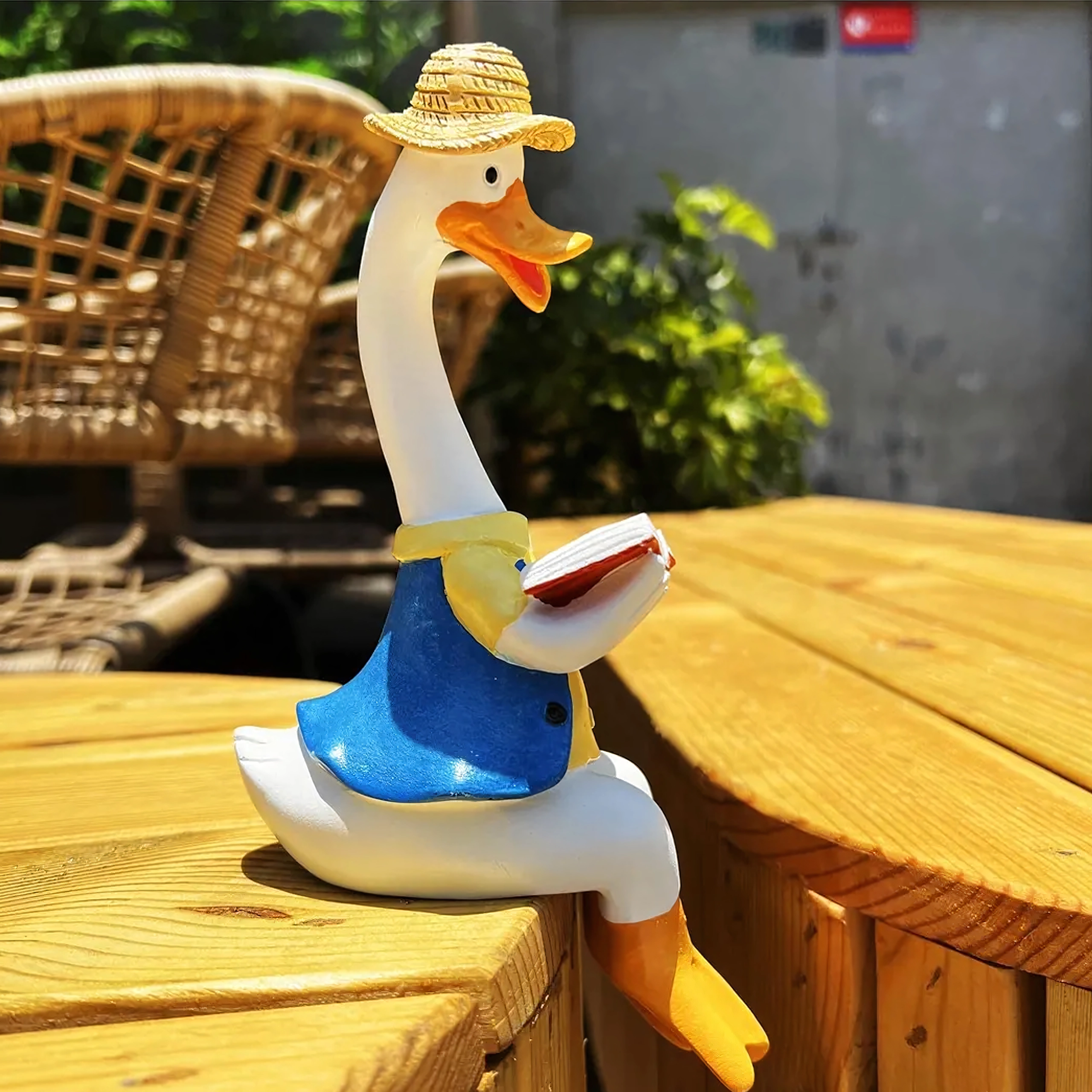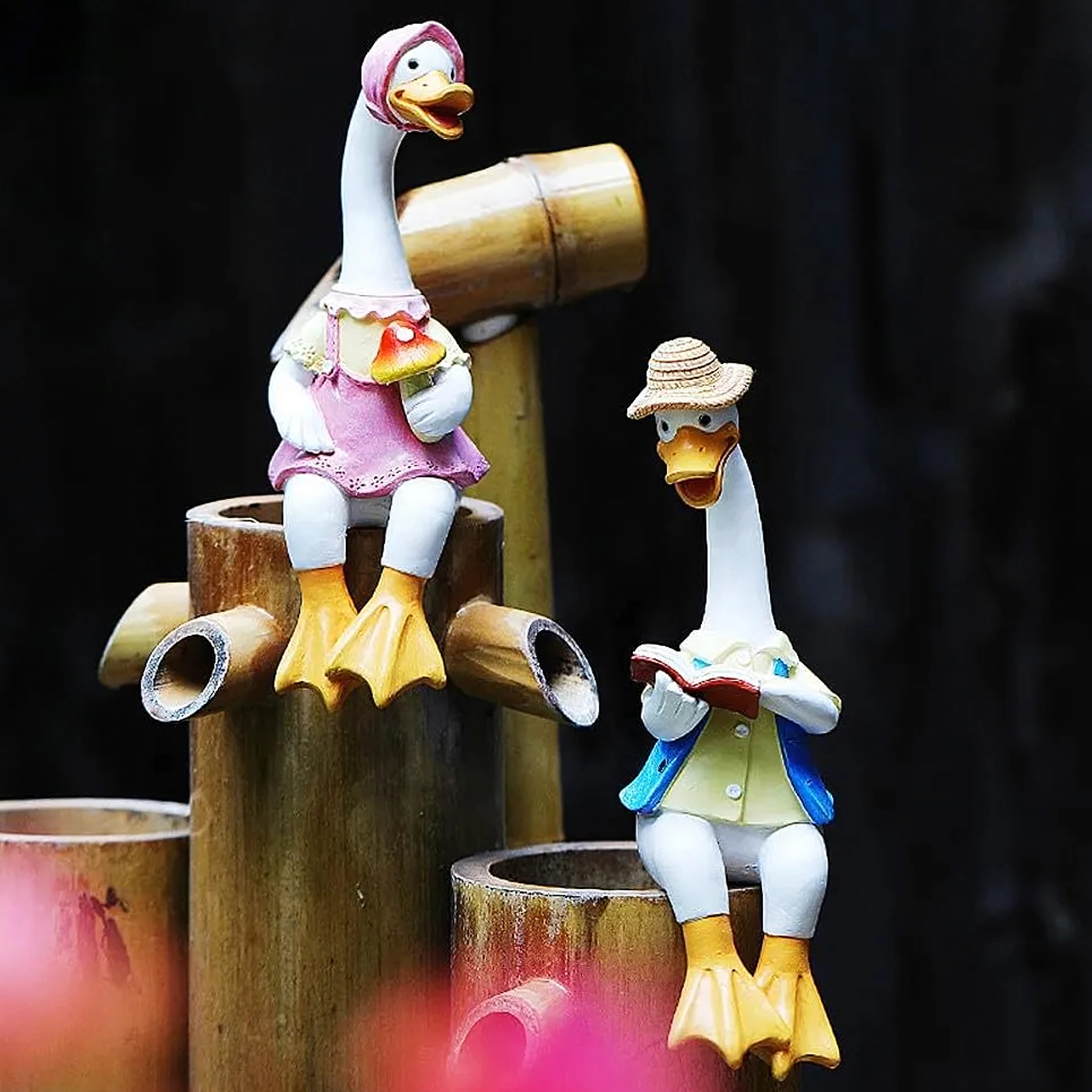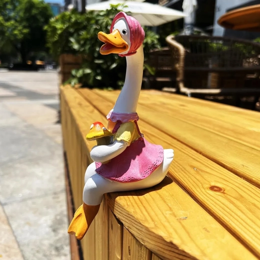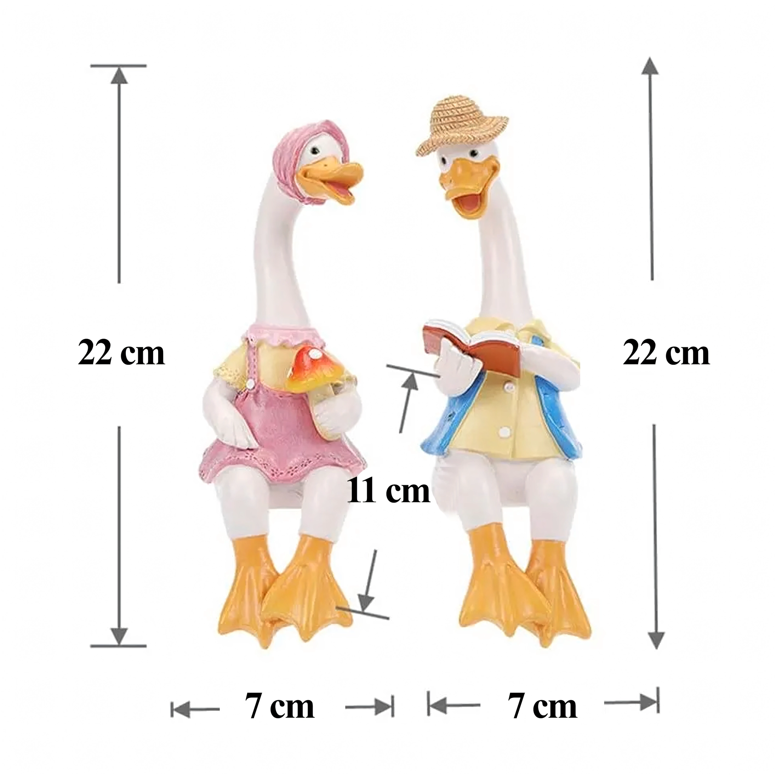 Zestaw zawiera dwie stylowe kaczuszki – jedną w różowej sukience z czepkiem i drobną dekoracją w dłoni oraz drugą w kapeluszu i niebieskiej kamizelce z otwartą książką. Obie figurki przeznaczone są do posadzenia na krawędzi, gdzie ich nóżki swobodnie zwisają, tworząc zabawny, pomysłowy akcent.