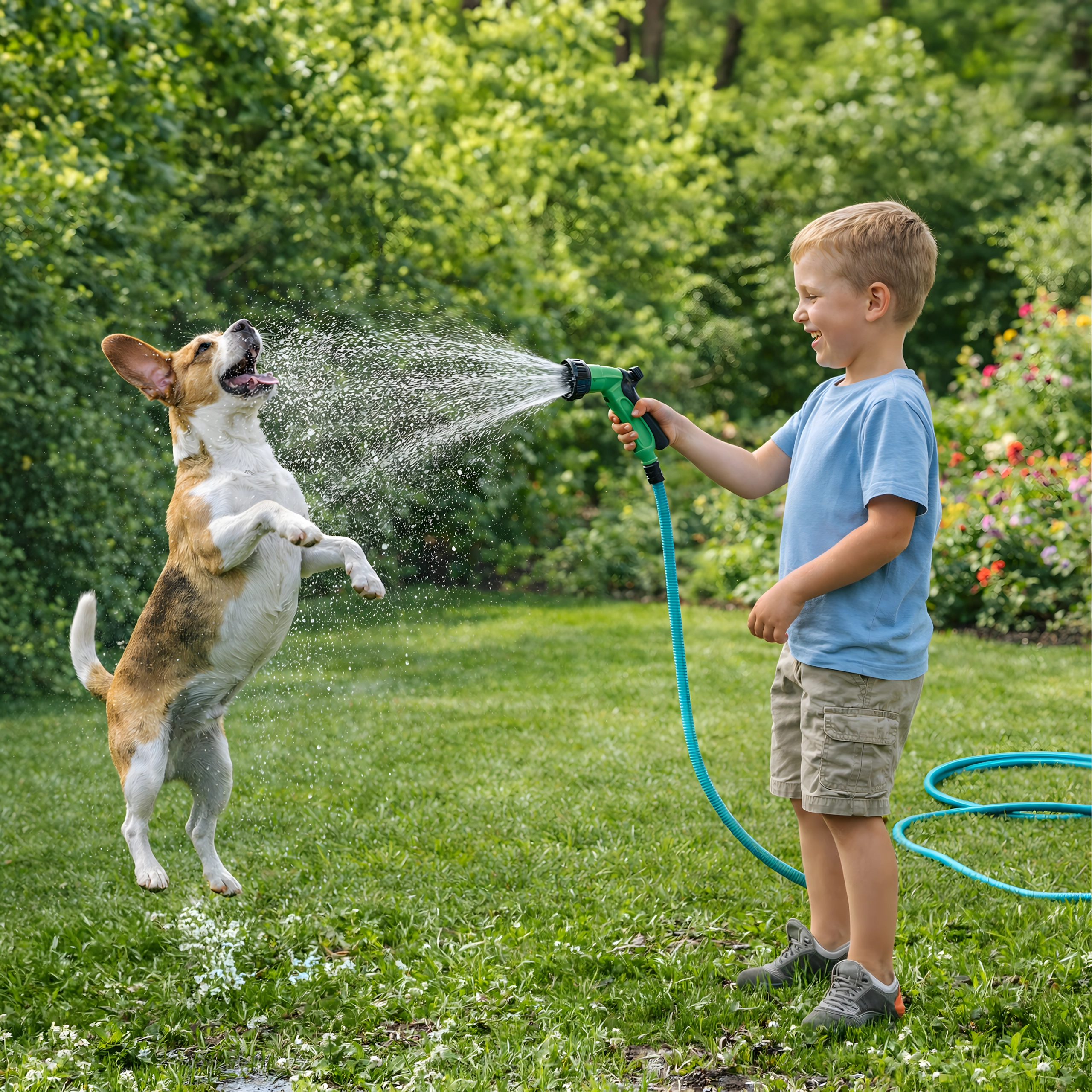 W zestawie znajduje się wielotrybny pistolet zraszający do delikatnej mgiełki, prysznica i mocnego strumienia – idealny do podlewania rabat, mycia auta lub spłukiwania tarasów. Wąż jest lekki, łatwy do przenoszenia i przechowywania na uchwycie lub w skrzyni.