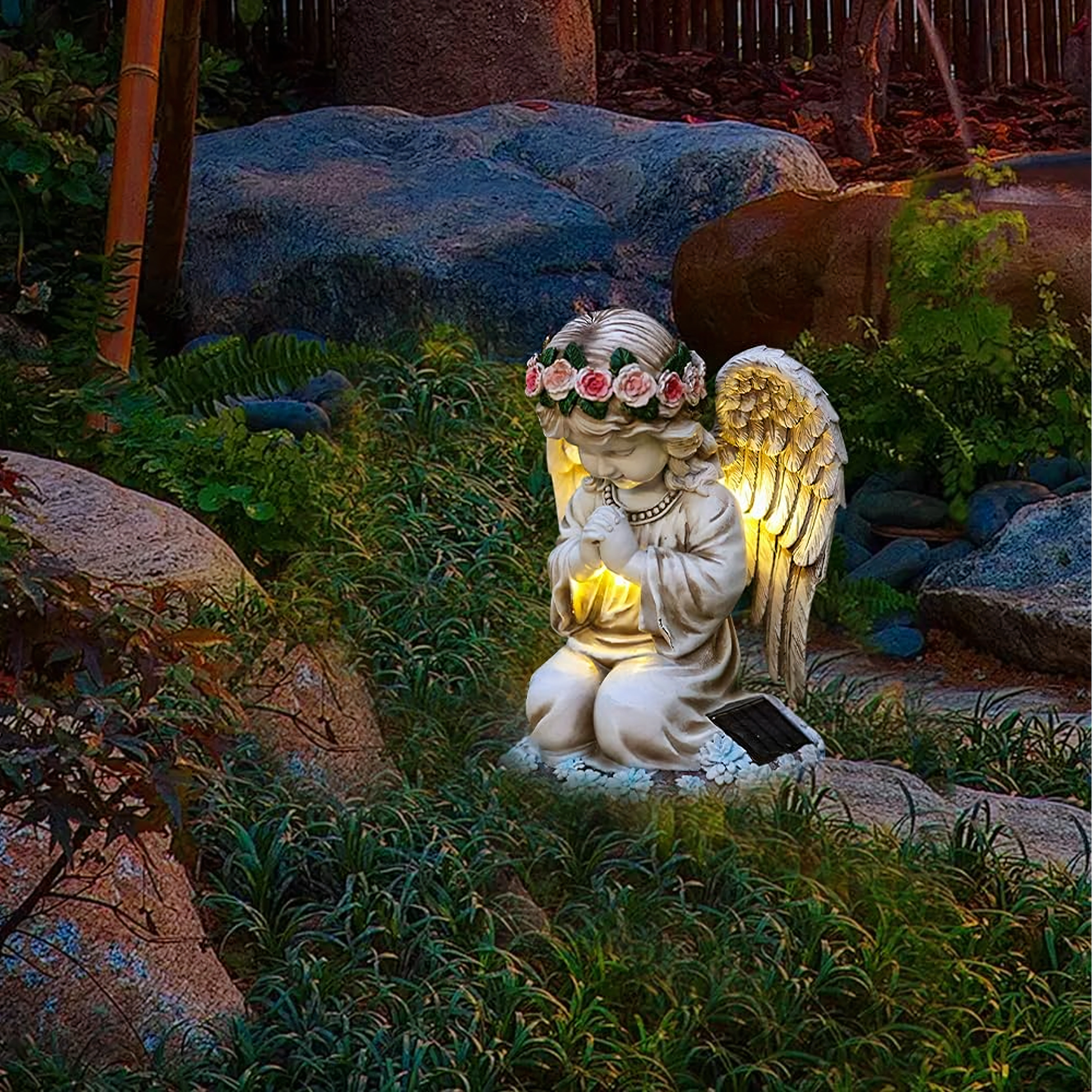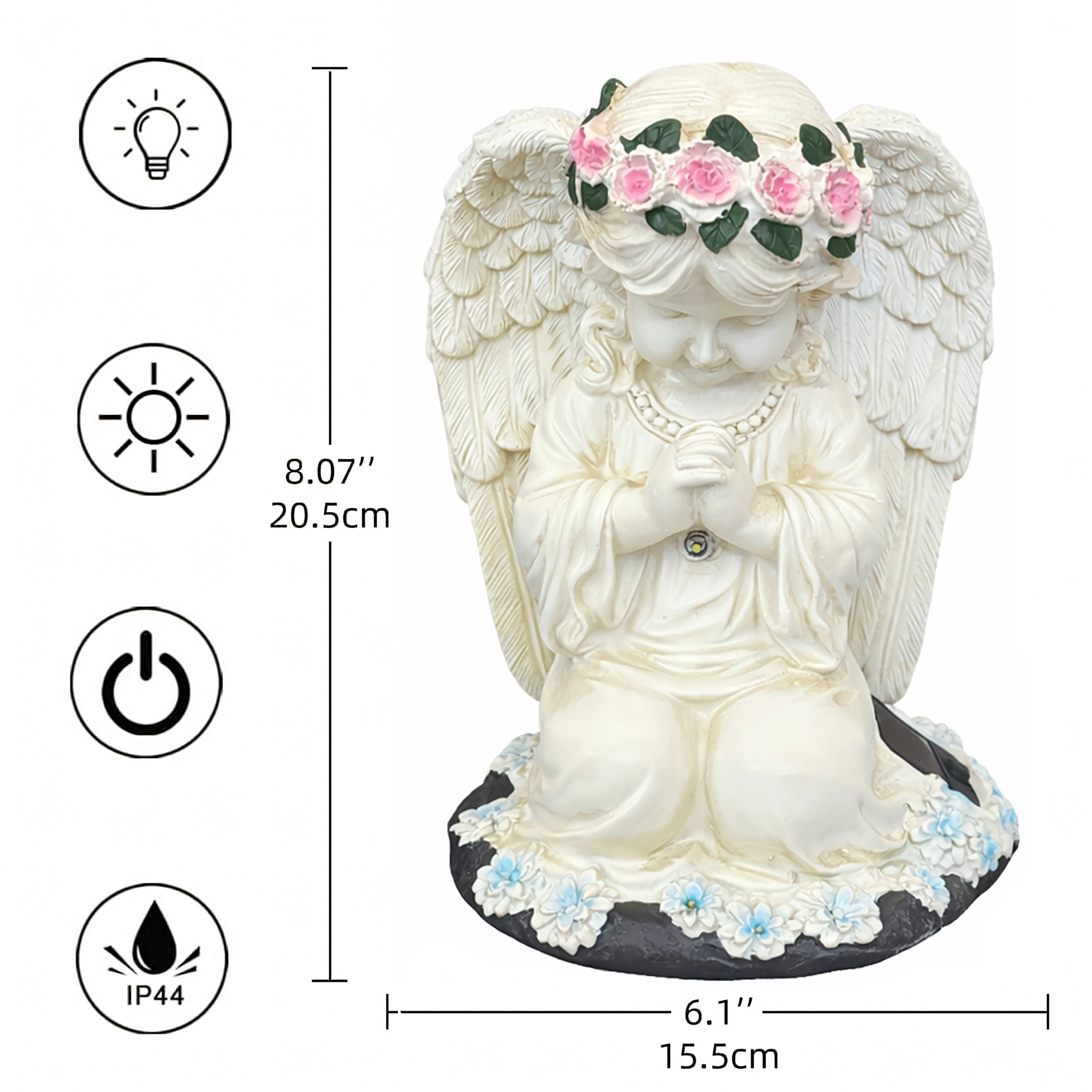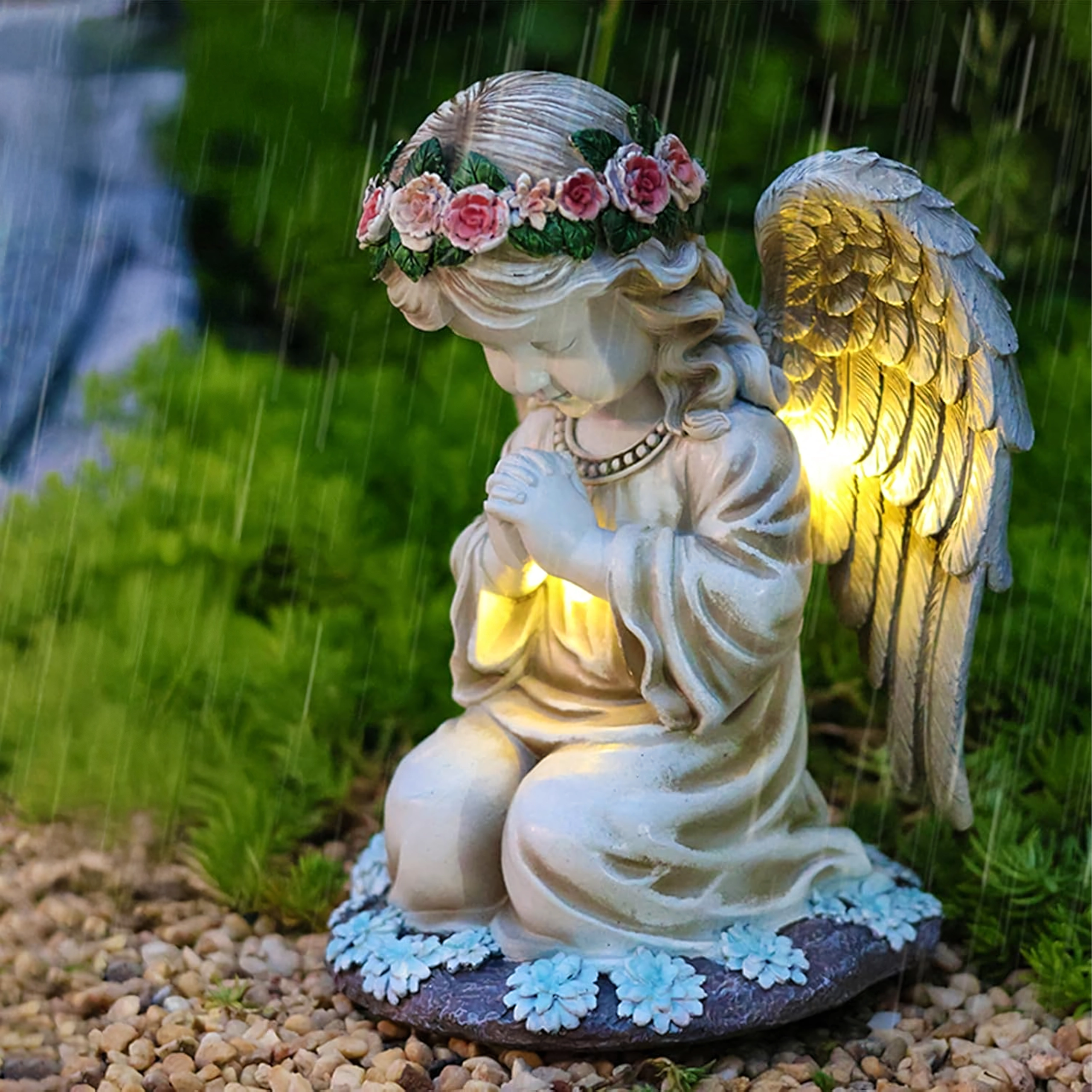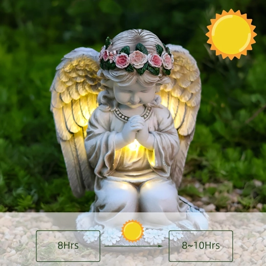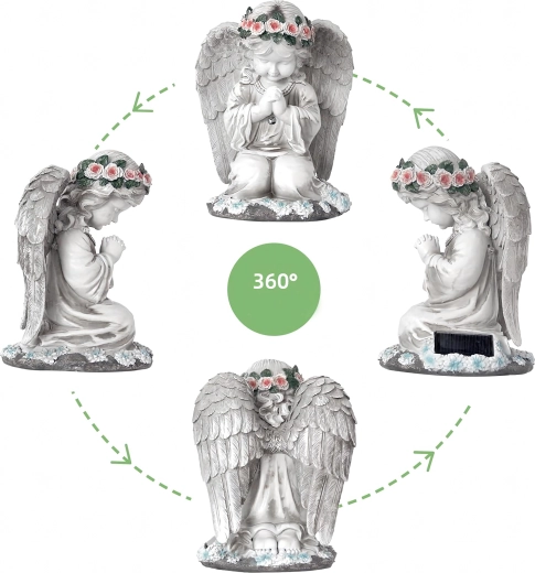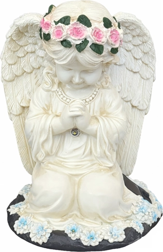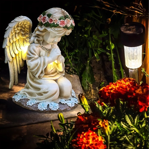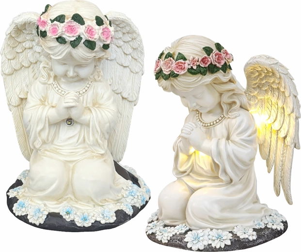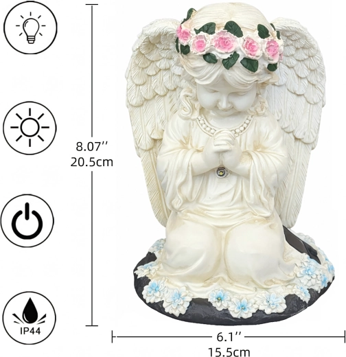 Ta misternie wykonana figurka klęczącego anioła z kwiatowym wieńcem i bogato modelowanymi skrzydłami została zaprojektowana do całorocznego użytku na zewnątrz. Wbudowane ciepłe diody LED subtelnie rozświetlają skrzydła i szatę, tworząc kojące wieczorne światło dla ogrodowych ścieżek, rabat oraz miejsc pamięci. Dzięki panelowi solarnemu w ciągu dnia ładuje się, a po zmroku włącza się automatycznie.