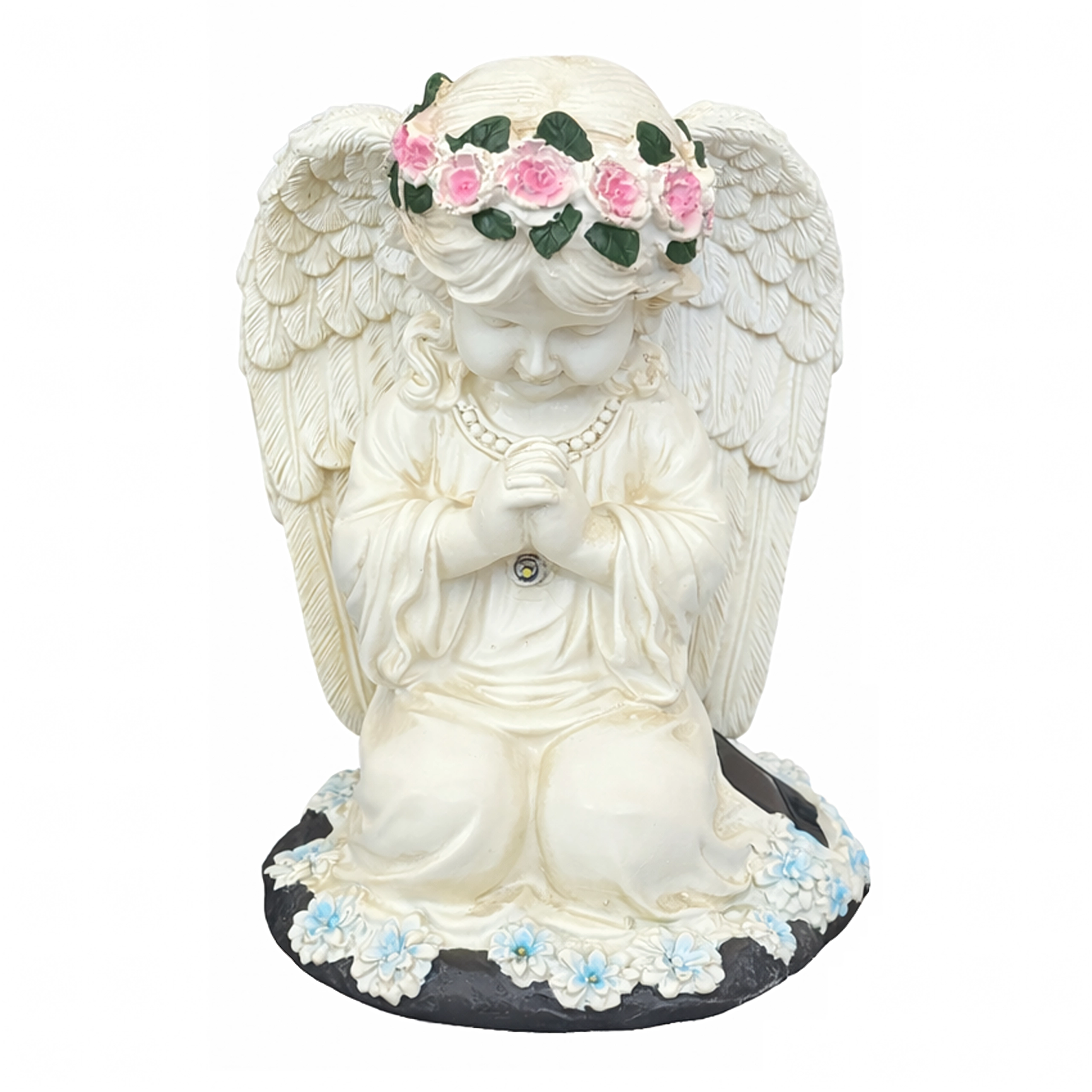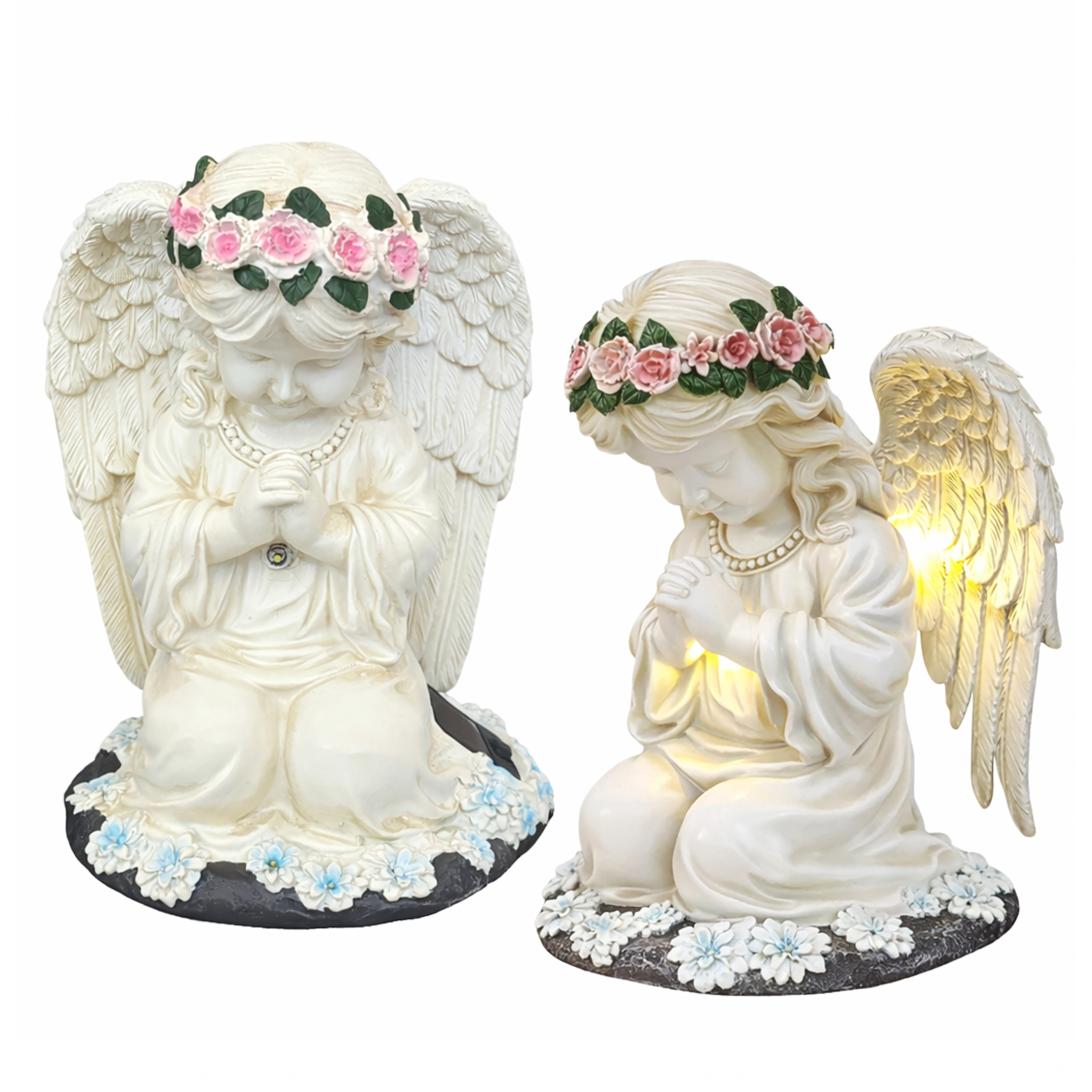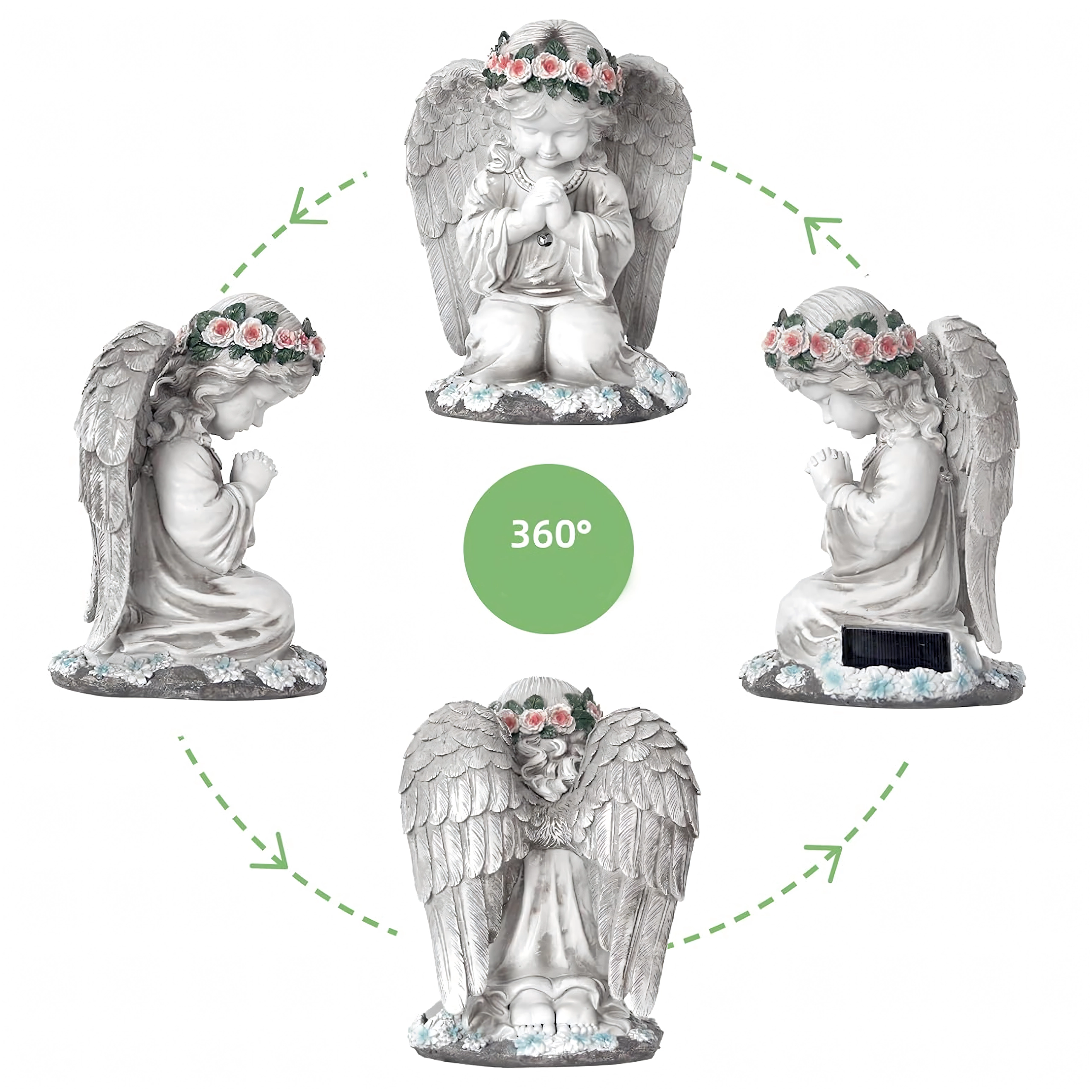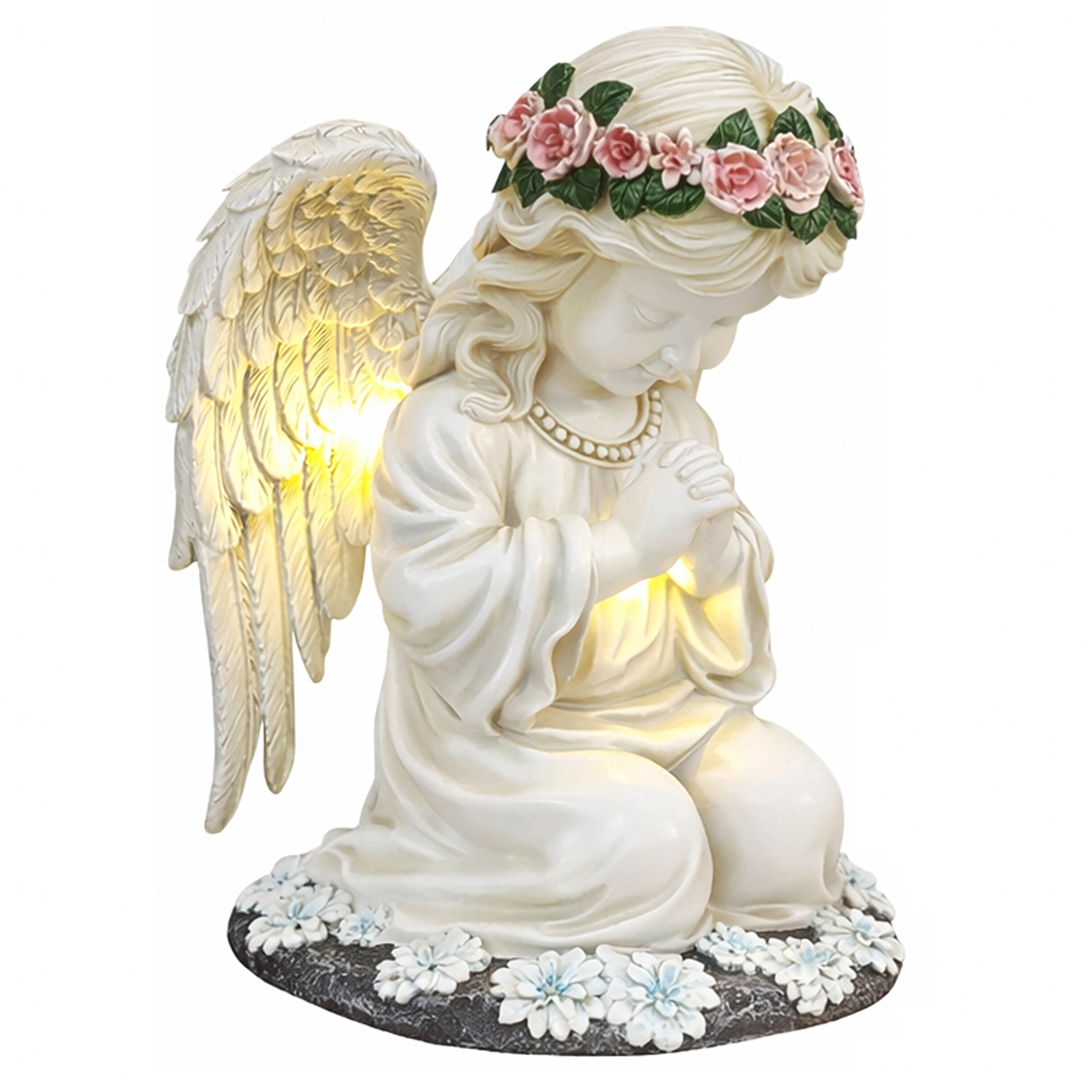 Ta misternie wykonana figurka klęczącego anioła z kwiatowym wieńcem i bogato modelowanymi skrzydłami została zaprojektowana do całorocznego użytku na zewnątrz. Wbudowane ciepłe diody LED subtelnie rozświetlają skrzydła i szatę, tworząc kojące wieczorne światło dla ogrodowych ścieżek, rabat oraz miejsc pamięci. Dzięki panelowi solarnemu w ciągu dnia ładuje się, a po zmroku włącza się automatycznie.