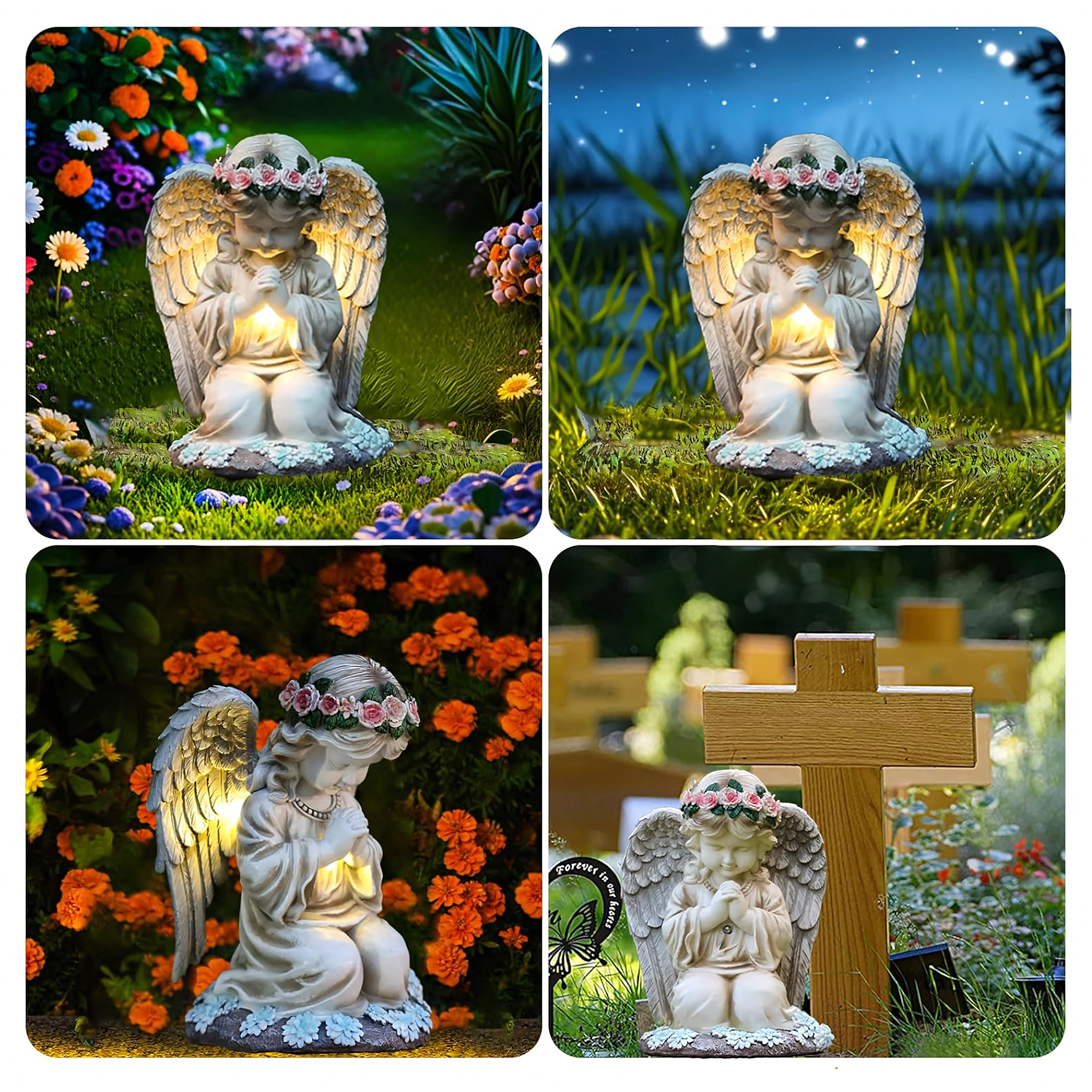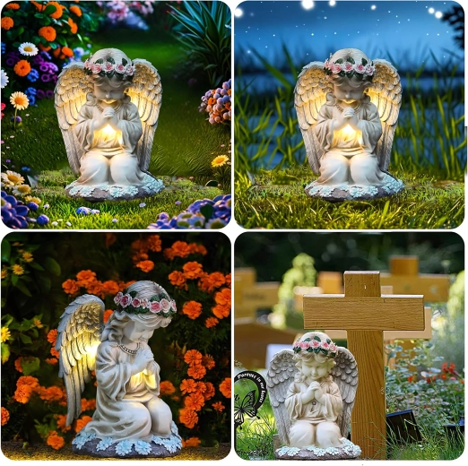 Odporna konstrukcja z żywicy z realistycznymi detalami piór i kwiatów jest odporna na deszcz, wiatr i śnieg. Figurka doskonale sprawdzi się jako dekoracja ogrodowa, dyskretny świecznik oraz światło pamięci o przyjemnym, spokojnym charakterze.