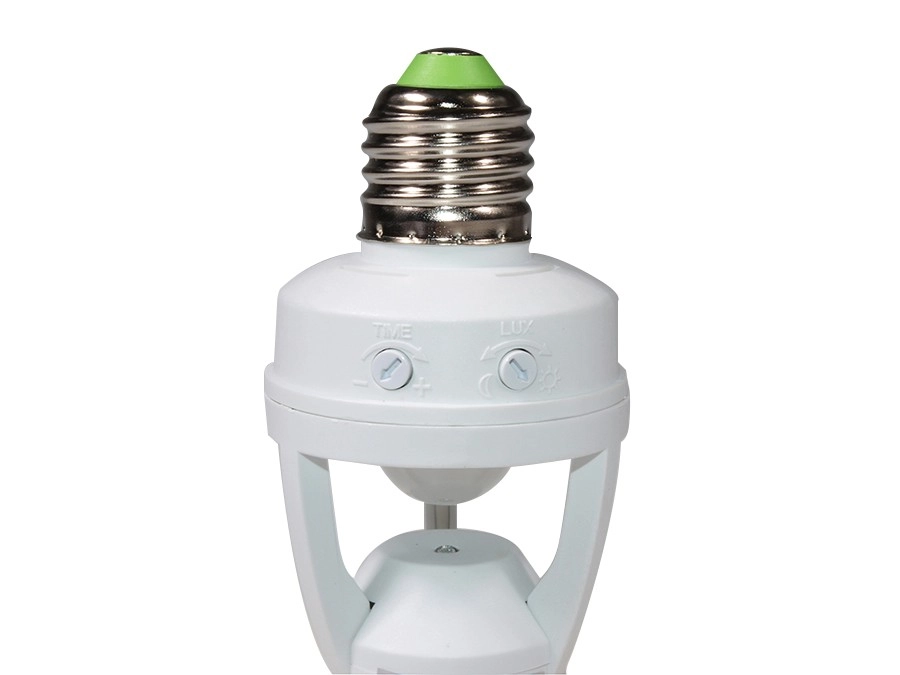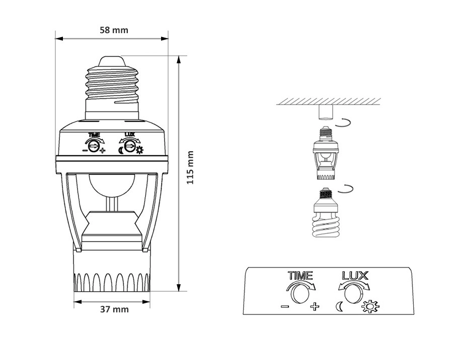 Instalacja zajmuje kilka minut: po prostu wkręć do istniejącego gniazda E27 i włóż żarówkę. Za pomocą pokręteł łatwo ustawisz czas podtrzymania (TIME) oraz próg oświetlenia (LUX). Czujnik wykorzystuje detekcję podczerwieni (PIR) i niezawodnie rozpoznaje dzień/noc, oszczędzając energię i koszty.