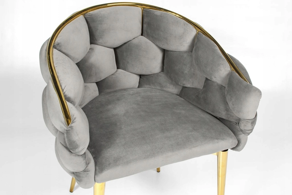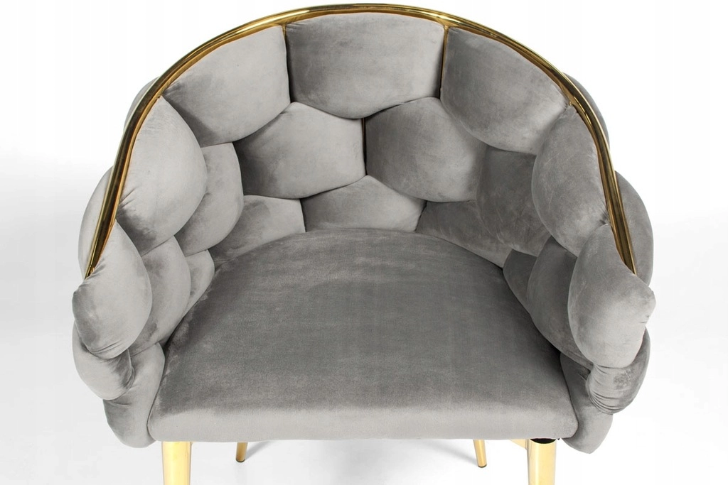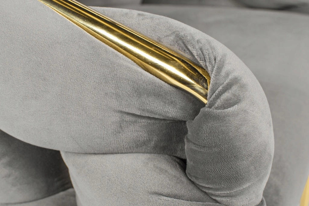 Smukłe metalowe nogi i złote wykończenie dodają wnętrzu luksusowego akcentu i perfekcyjnie współgrają z szarym aksamitem.