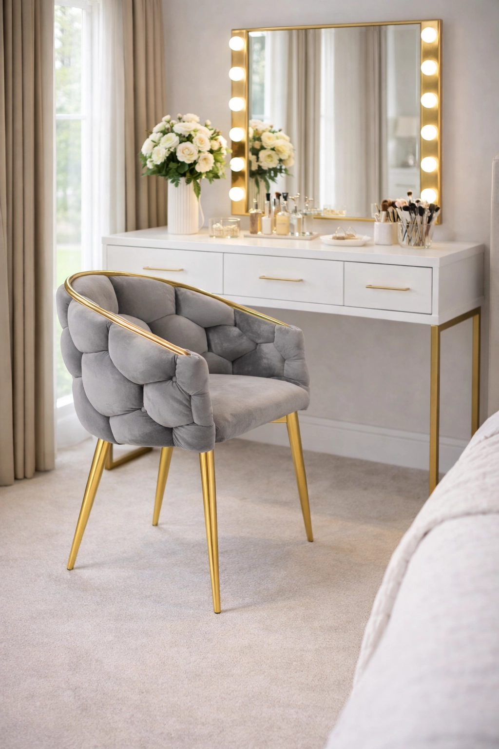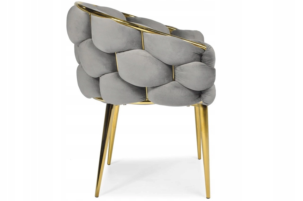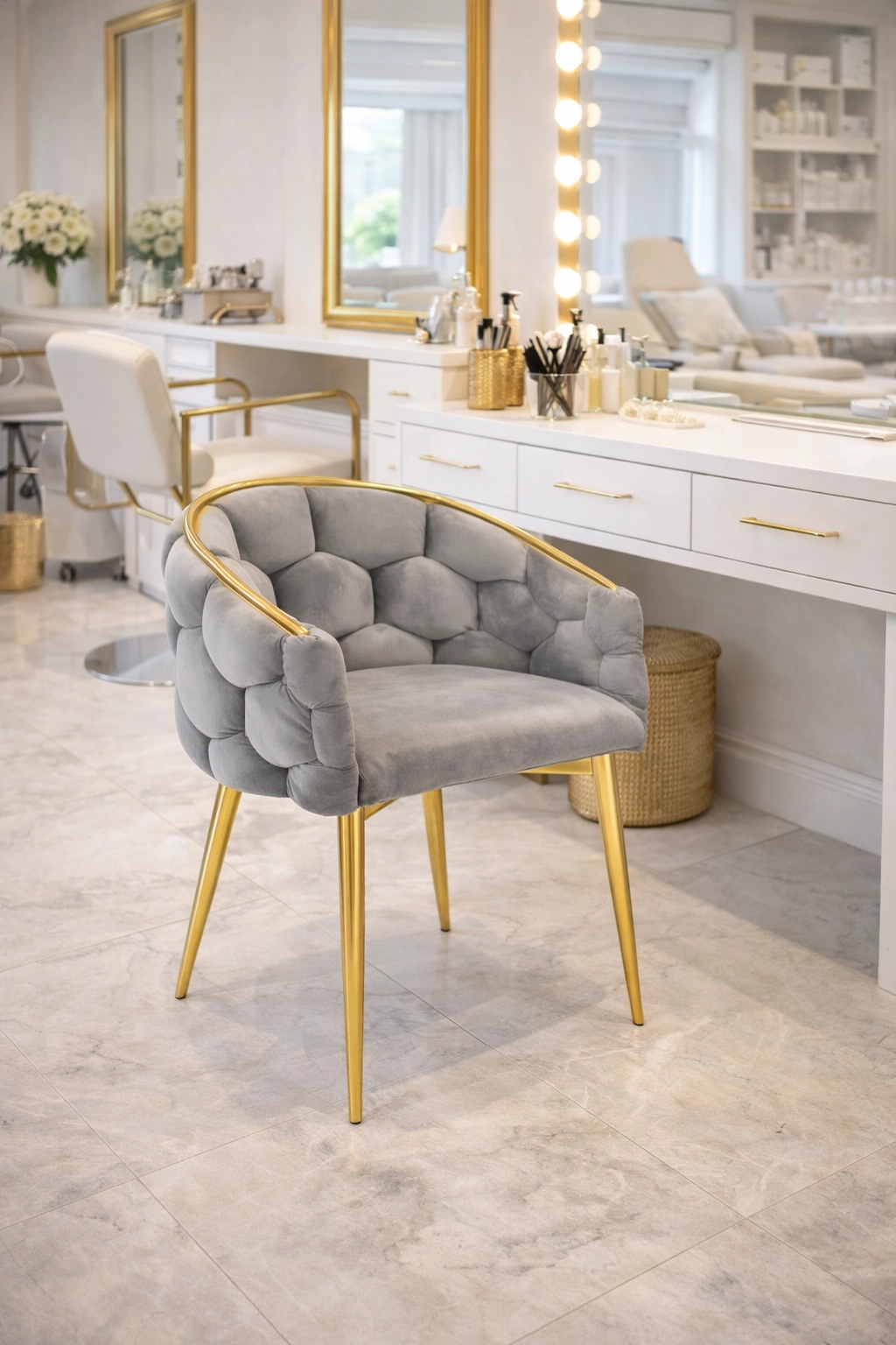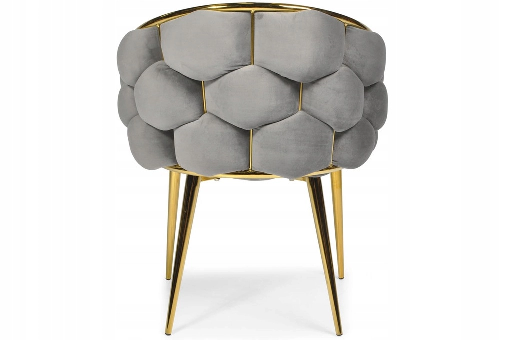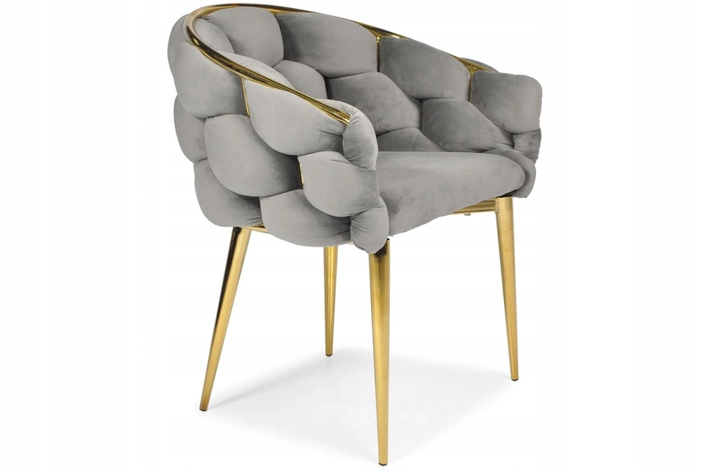 Eleganckie krzesło FERTONE BALLOON łączy luksusowy aksamit, wygodne fotelowe profilowanie i złote metalowe nogi w stylowym siedzisku do jadalni, salonu i toaletki. Miękkie pikowane wypełnienie, otulające oparcie oraz uniwersalny szary kolor zapewniają komfort i łatwe dopasowanie do nowoczesnego wnętrza. Udźwig do 100 kg i łatwa pielęgnacja do codziennego użytku.