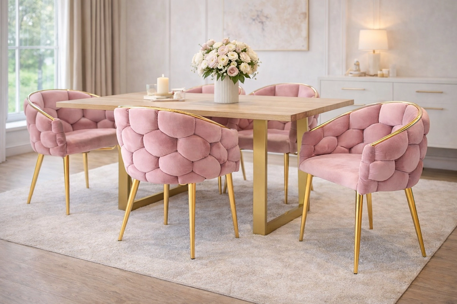• Design glamour: połączenie różowego aksamitu i złotej stali