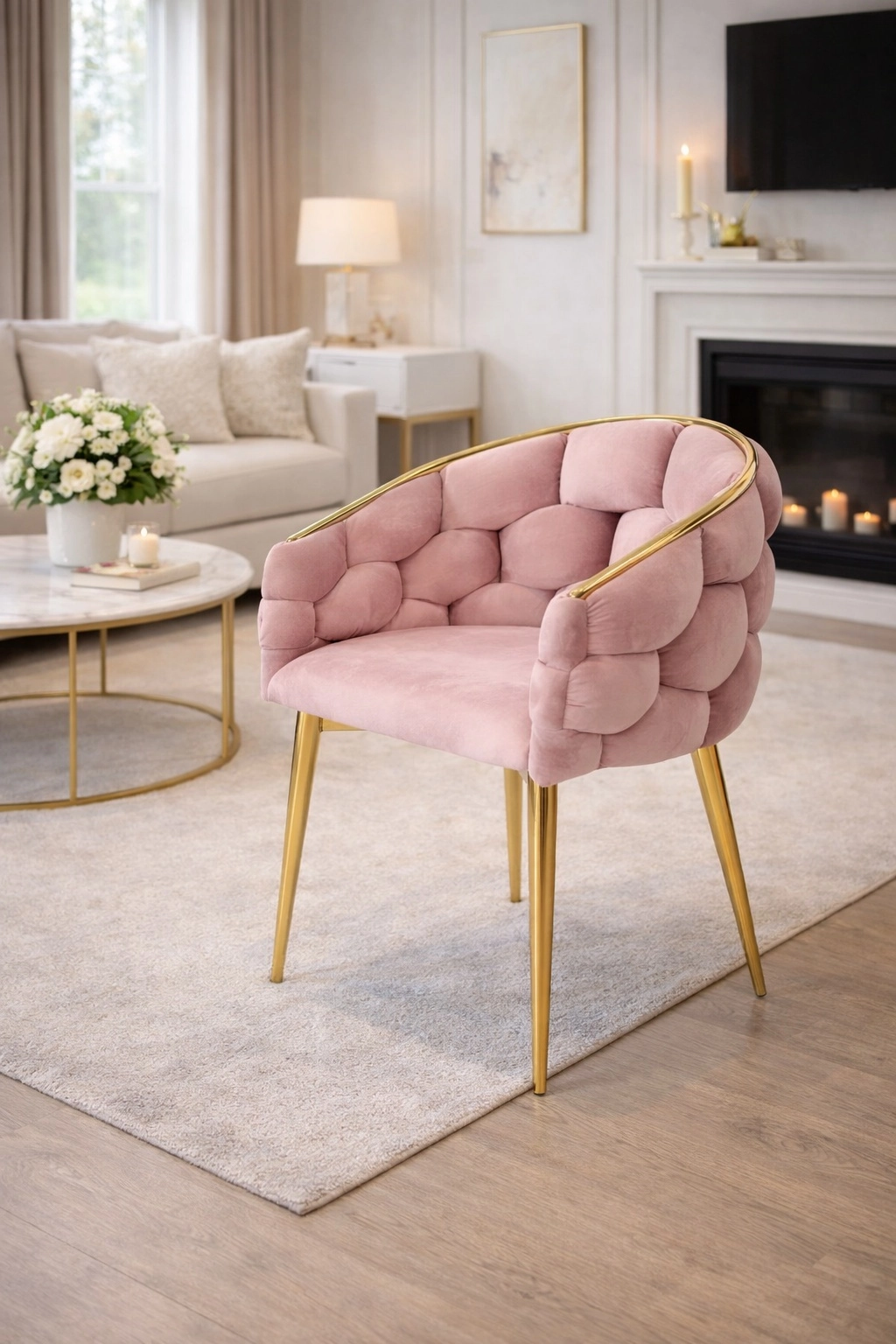 Eleganckie krzesło w stylu glamour z różowym aksamitem i złotymi metalowymi nogami oferuje komfortowe kubełkowe (bucket) siedzisko z podparciem pleców. Miękkie aksamitne obicie z delikatnym połyskiem dodaje wnętrzu szyku, a solidna stalowa konstrukcja zapewnia stabilność na co dzień – idealne do jadalni, salonu oraz do toaletki.