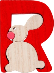 Drewniana litera R z króliczkiem pomaga dzieciom w przystępny, zabawny sposób opanować podstawy alfabetu. Może służyć jako element układanki, do ułożenia imienia lub jako dekoracja na ścianę czy meble (przy użyciu dwustronnej taśmy klejącej). Masywna konstrukcja zapewnia długą żywotność i bezpieczną zabawę.