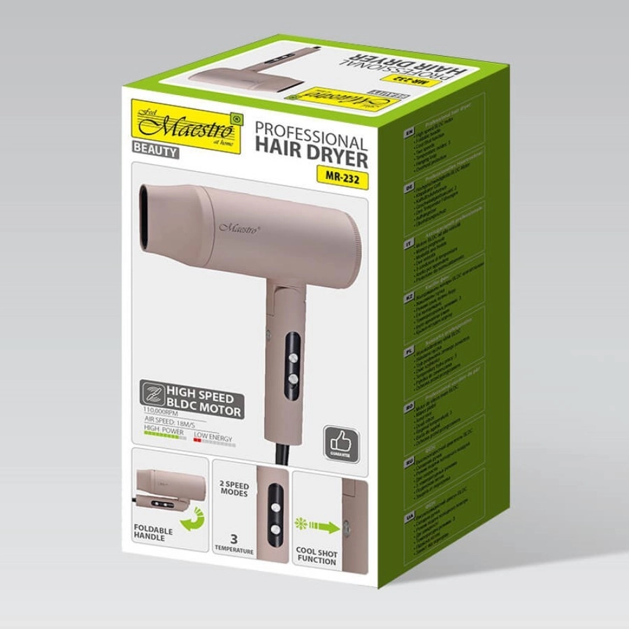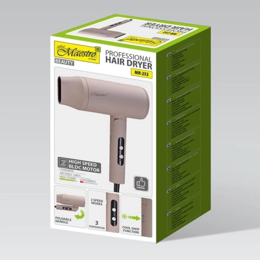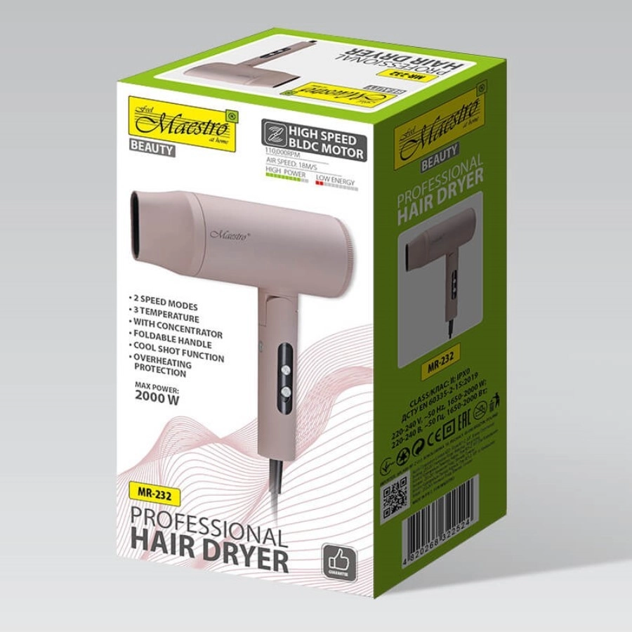 MAESTRO MR-232 to idealny wybór do codziennej pielęgnacji i na wyjazdy. Dzięki silnikowi BLDC o długiej żywotności i mocy 2000 W suszy włosy szybko i delikatnie, a przepływ powietrza 18 m/s poradzi sobie nawet z gęstymi i długimi włosami. Precyzyjne ustawienia dzięki 2 prędkościom i 3 poziomom temperatury uzupełnia zimny nawiew do finalnego utrwalenia i nadania blasku.