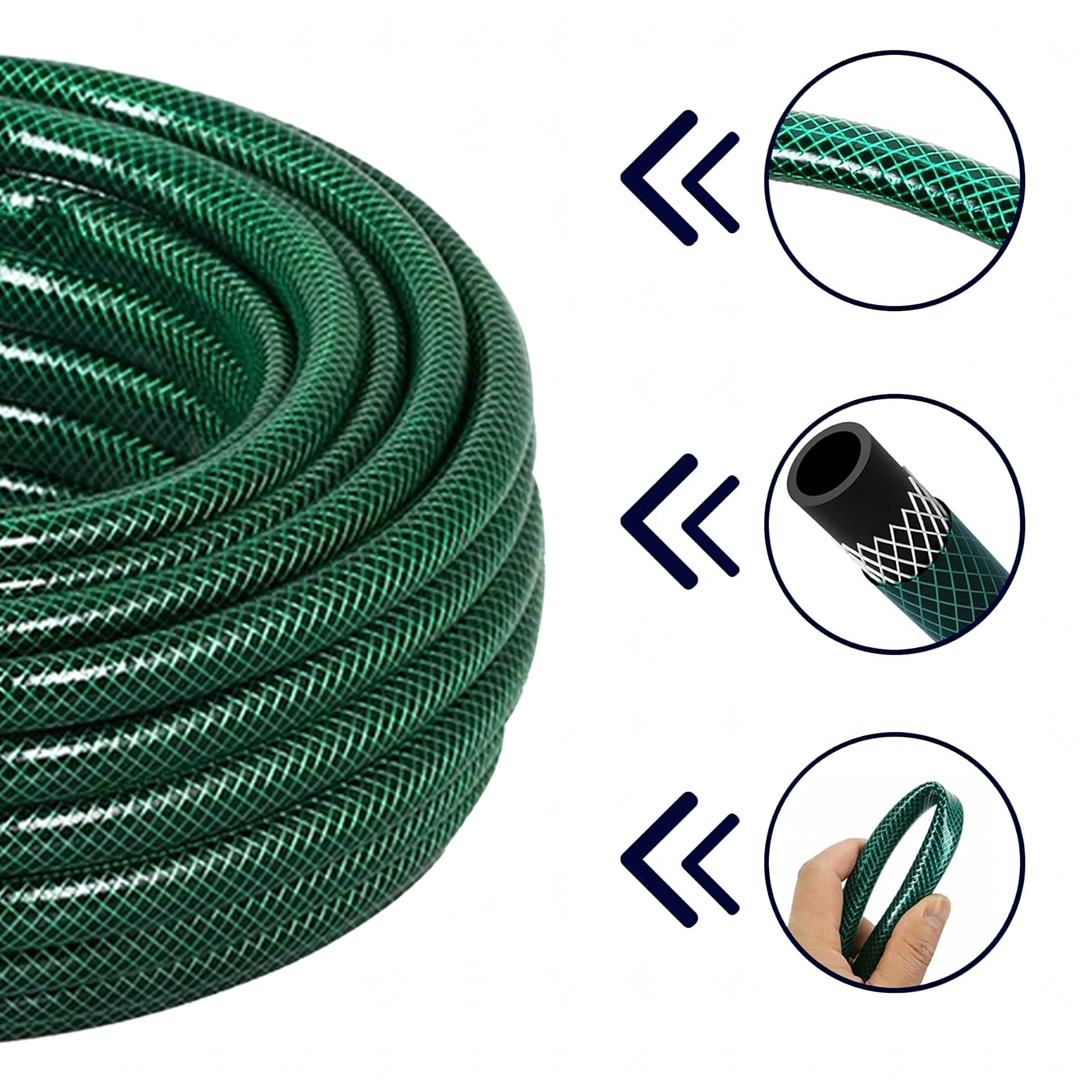 Wzmocnienie z krzyżowym oplotem pomaga zapobiegać skręcaniu i załamywaniu węża, dzięki czemu nawadnianie jest płynne i nieprzerywane.