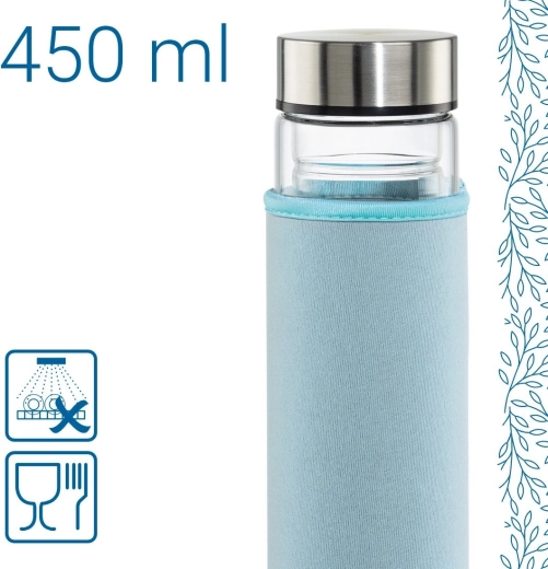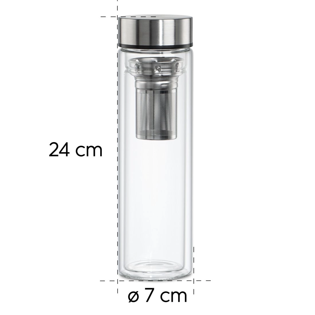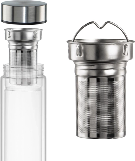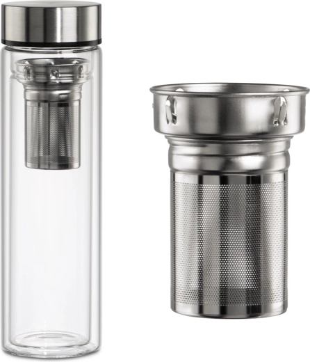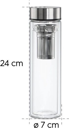 Dzięki wysokiej jakości szkłu borokrzemowemu butelka jest lekka, wytrzymała i neutralna smakowo. Stalowa nakrętka z silikonową uszczelką zapobiega przeciekaniu w torbie lub plecaku. Wyjmowane drobne sitko z praktycznym uchwytem ułatwia obsługę i czyszczenie.