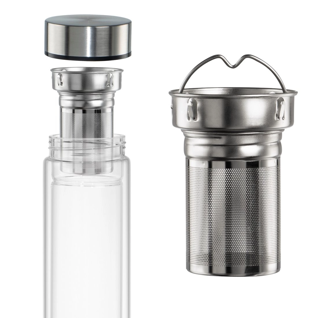 Wyjmowane stalowe sitko umożliwia parzenie herbaty liściastej lub infuzowanie wody świeżymi owocami. Drobna siatka zatrzymuje małe cząsteczki, a uchwyt ułatwia bezpieczne wyjmowanie i czyszczenie.