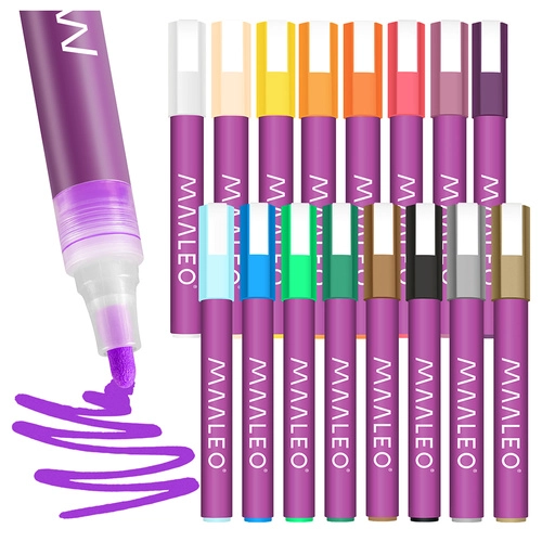 Odkryj kreatywny zestaw markerów akrylowych MAALEO z prawdziwą farbą akrylową dla intensywnego krycia i trwałych dekoracji na wielu powierzchniach. Zestaw 16 wyrazistych odcieni zapewnia szybkoschnącą i po wyschnięciu wodoodporną powłokę bez przesiąkania – idealną na papier, drewno, kamień, szkło, metal i ceramikę.
