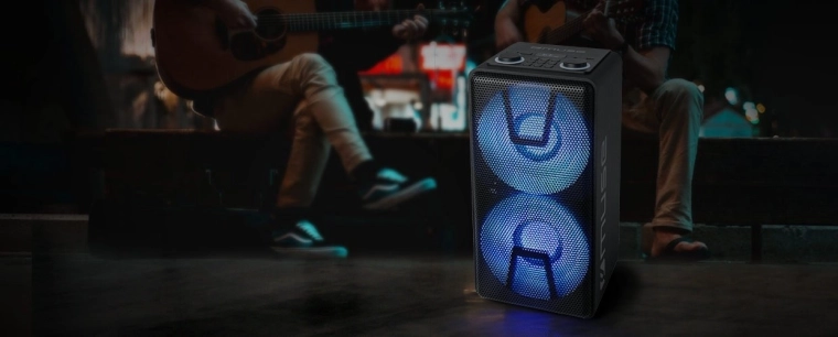 Dzięki wbudowanemu akumulatorowi Li‑ion 1500 mAh / 7,4 V możesz cieszyć się muzyką bez gniazdka. Do występów na żywo lub karaoke służą wejście MIC i wejście gitarowe, a 3,5‑mm AUX in uzupełnia klasyczne połączenie przewodowe. Funkcja parowania stereo umożliwia połączenie dwóch kompatybilnych głośników i stworzenie szerszej, bardziej przestrzennej sceny dźwiękowej.