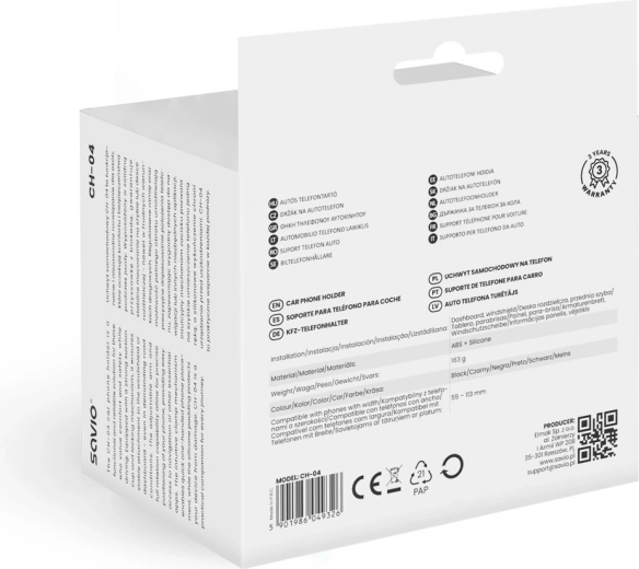 Uniwersalny uchwyt samochodowy Savio z przyssawką utrzyma Twój telefon pewnie i bezpiecznie na przedniej szybie lub desce rozdzielczej. Oferuje stabilne mocowanie, obrotowy przegub 360° oraz teleskopowo regulowaną długość dla idealnego ustawienia. Miękkie wkładki silikonowe chronią urządzenie przed zarysowaniami, a szczęki mieszczą większość smartfonów o szerokości 55–113 mm.