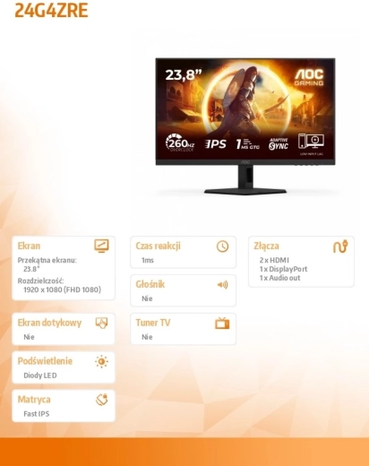 AOC 24G4ZRE to kompaktowy 23,8" monitor do gier, który łączy ostry obraz technologii Fast IPS z wysoką częstotliwością odświeżania 240 Hz dla wyjątkowo płynnych wrażeń. Idealny do rozgrywek konkurencyjnych i dynamicznej pracy, gdzie docenisz precyzyjne kolory i szerokie kąty widzenia.