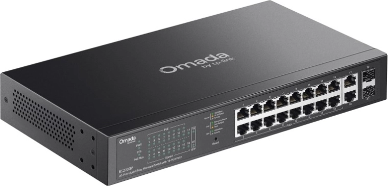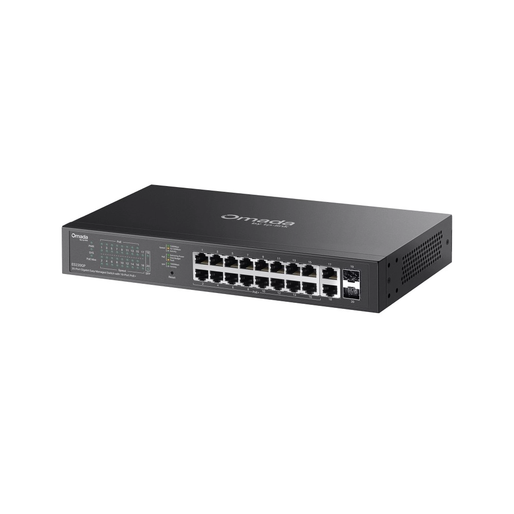 Omada Easy Managed ES220GP to niezawodny przełącznik gigabitowy do biur i instalacji bezpieczeństwa. Oferuje 16 portów PoE+ do zasilania kamer, punktów dostępowych czy telefonów VoIP oraz dwa sloty SFP do rozbudowy sieci światłowodem. Dzięki cichej, bezwentylatorowej konstrukcji sprawdzi się także w spokojnych przestrzeniach roboczych.
