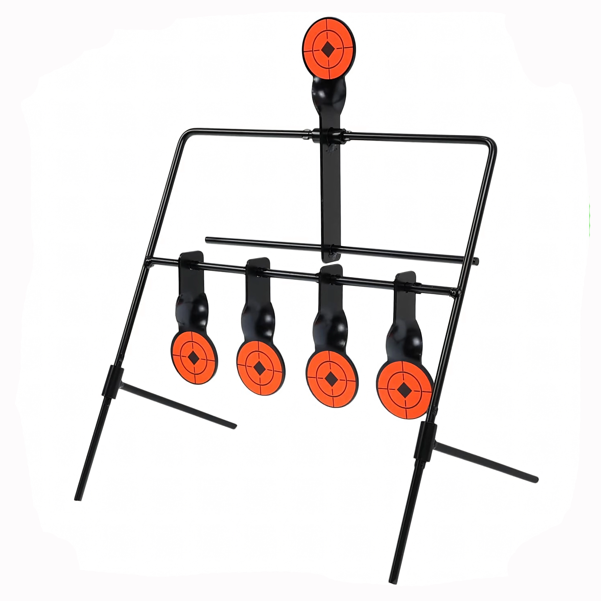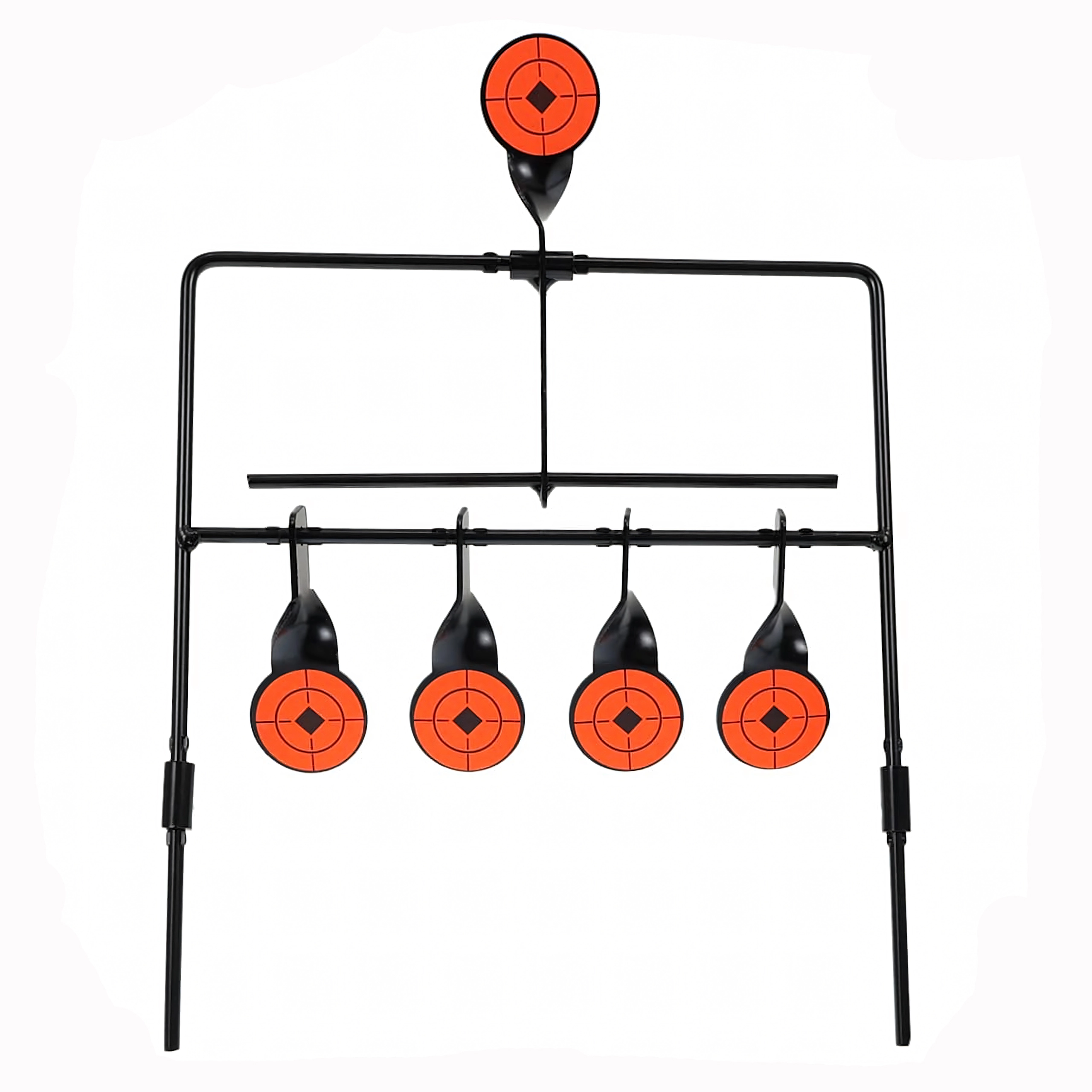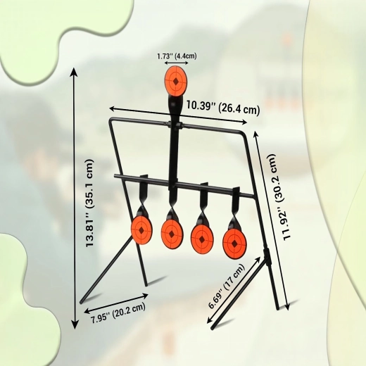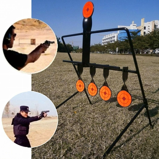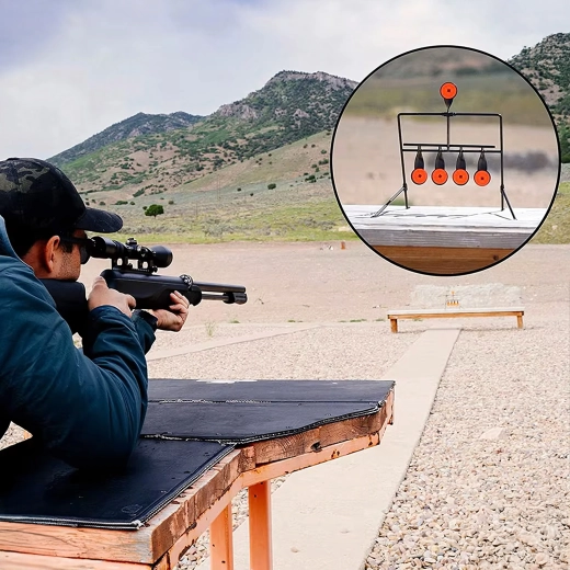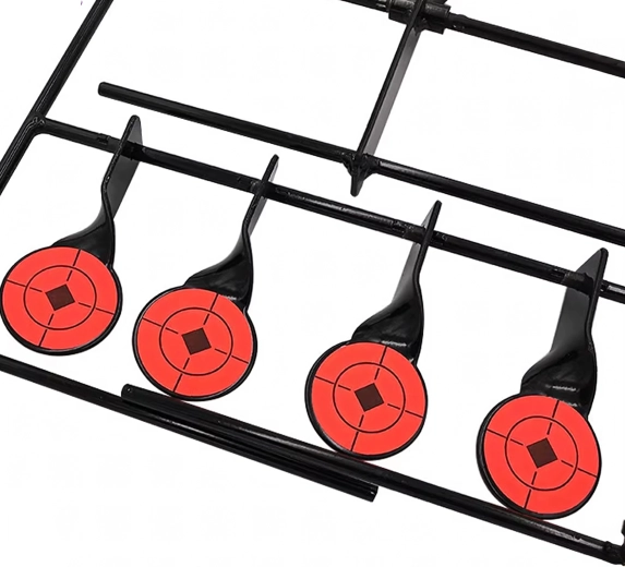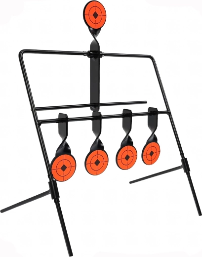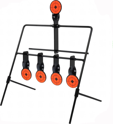Praktyczna stalowa tarcza strzelecka z pięcioma reaktywnymi celami i górnym resetem dla płynnego treningu celowania. Dzięki wyraźnym pomarańczowym tarczom trafienia są łatwo widoczne, a konstrukcja samoczynnie się przechyla po trafieniu. Idealna do treningu precyzji i szybkości – stabilna rama, łatwy montaż oraz automatyczne resetowanie bez potrzeby przerywania strzelania.