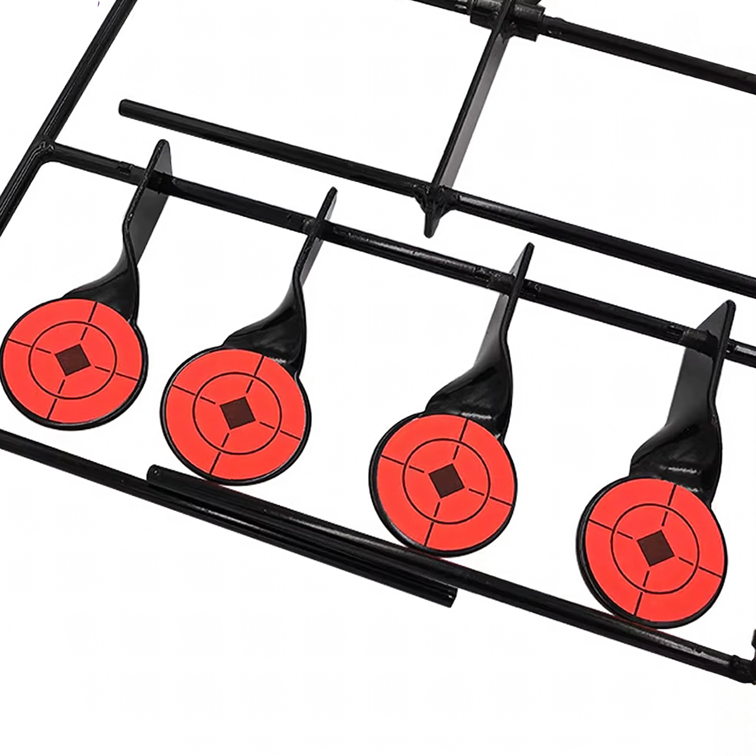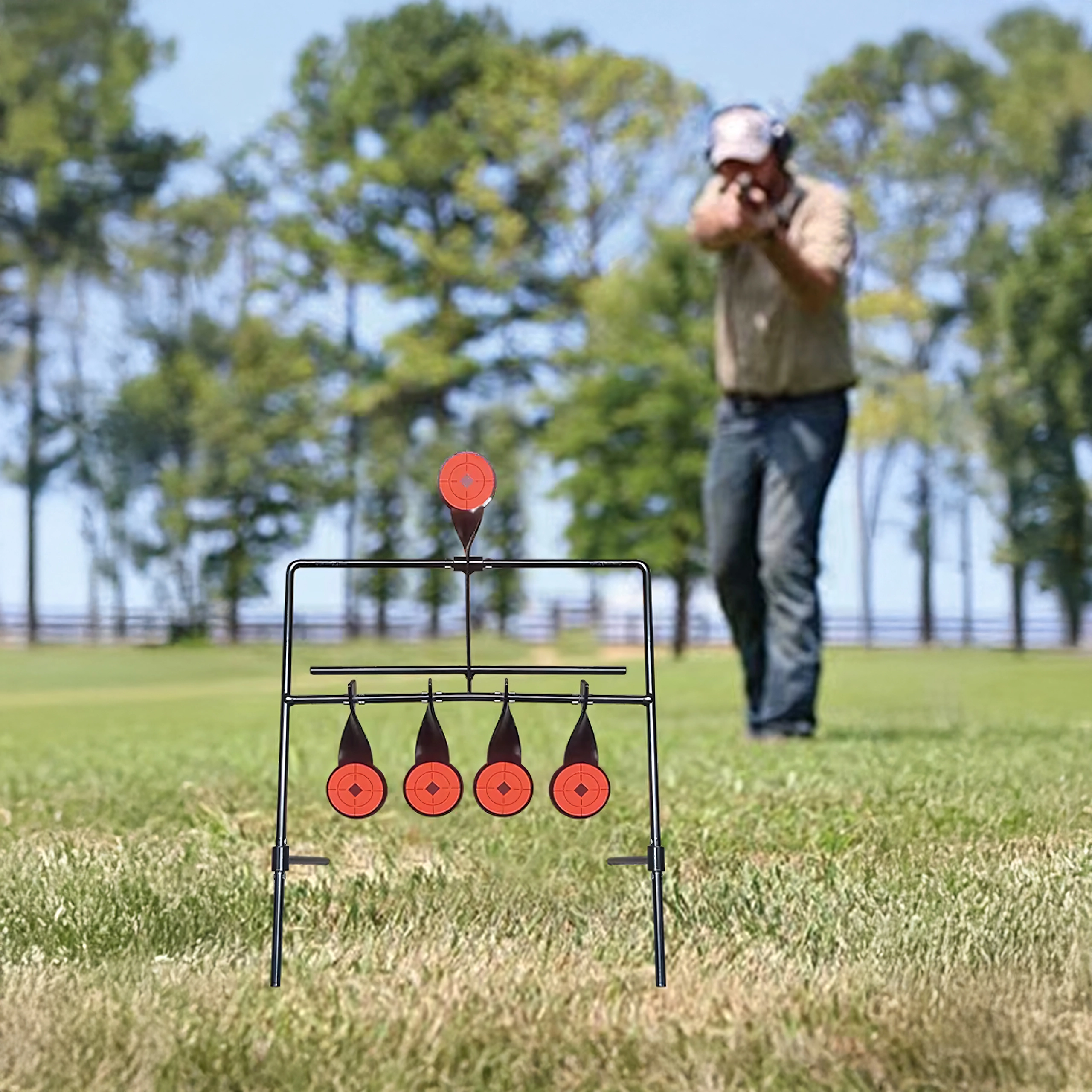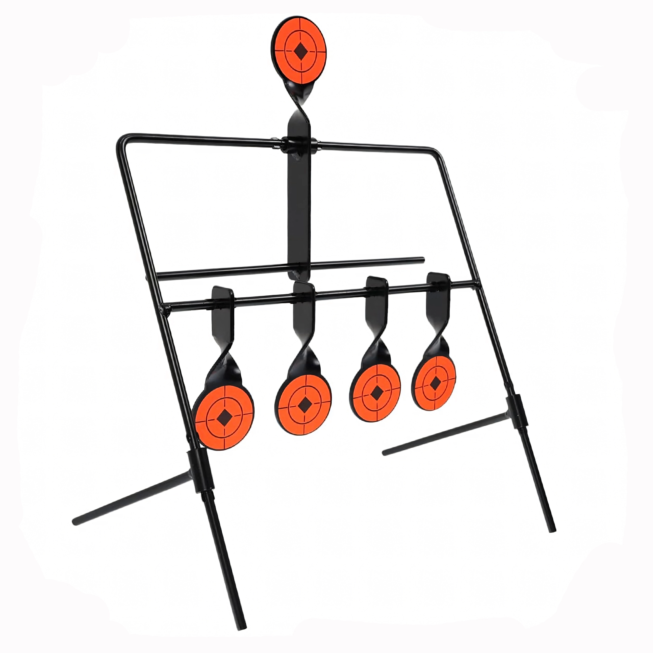 Praktyczna stalowa tarcza strzelecka z pięcioma reaktywnymi celami i górnym resetem dla płynnego treningu celowania. Dzięki wyraźnym pomarańczowym tarczom trafienia są łatwo widoczne, a konstrukcja samoczynnie się przechyla po trafieniu. Idealna do treningu precyzji i szybkości – stabilna rama, łatwy montaż oraz automatyczne resetowanie bez potrzeby przerywania strzelania.