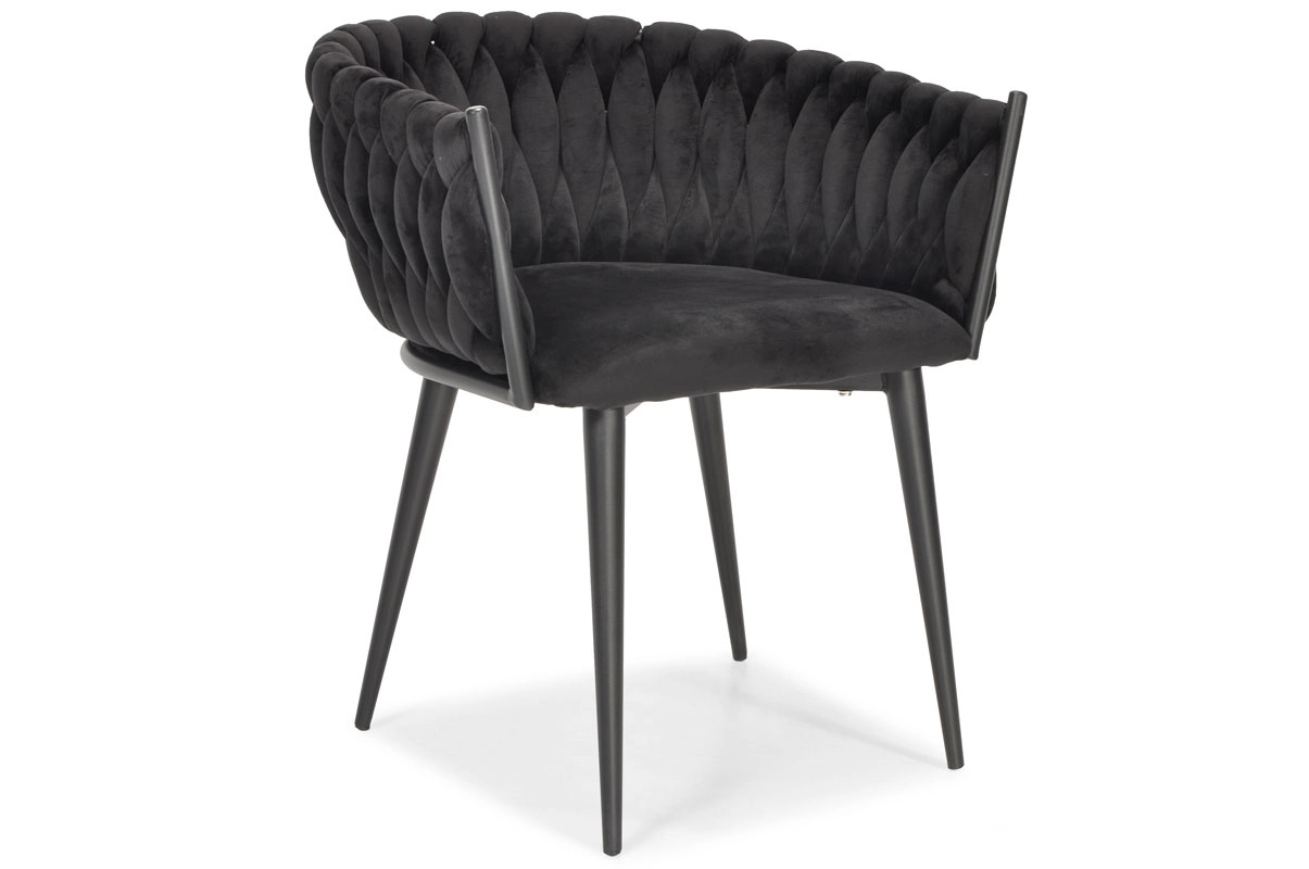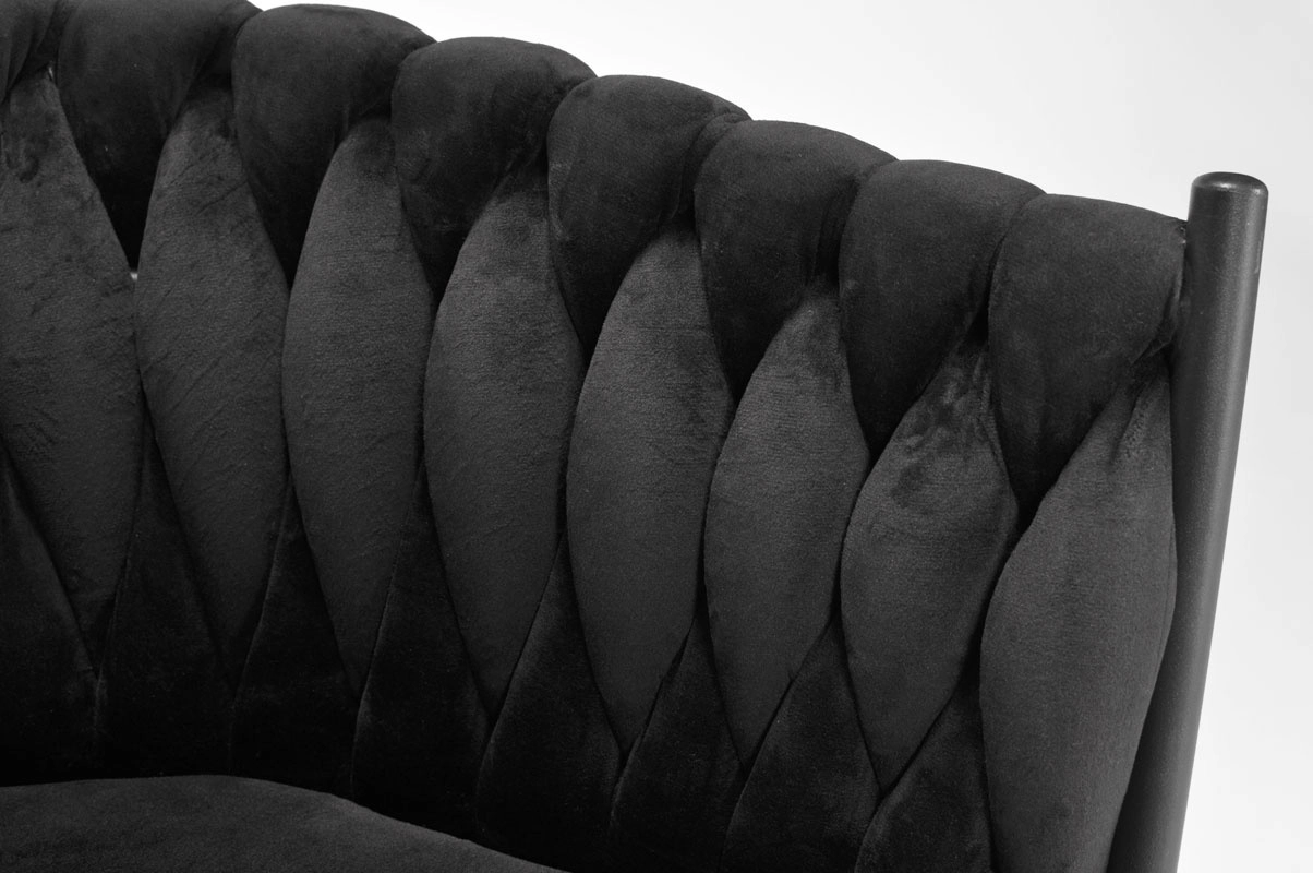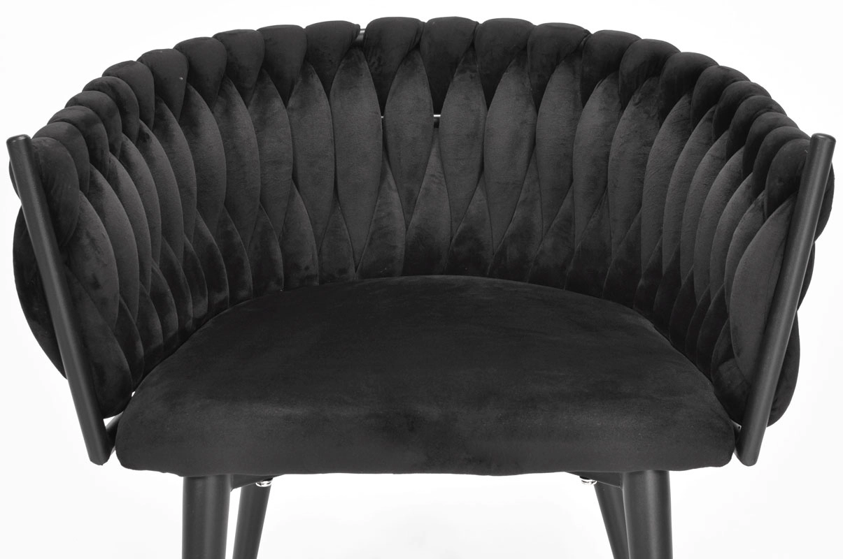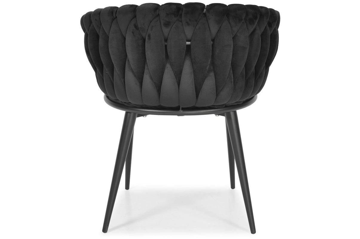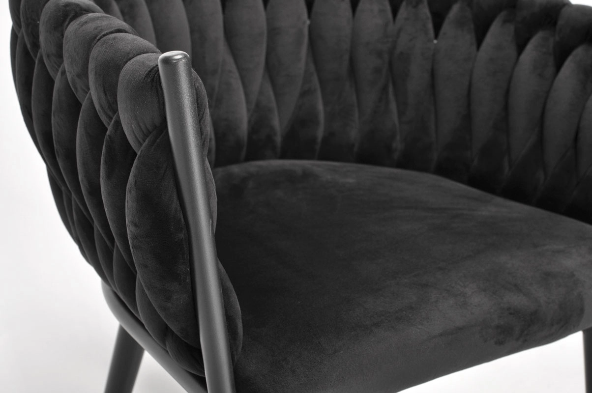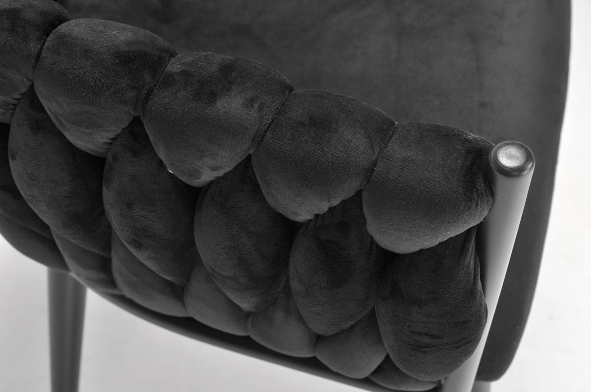 Elegancki fotel ROSA w głębokiej czerni łączy luksusowy aksamit, dekoracyjne, plecione oparcie oraz smukłe, stabilne nogi w stylowy akcent do salonu, jadalni i kącika beauty. Zapewnia wygodne, tapicerowane siedzisko i natychmiast dodaje wnętrzu efektu glamour oraz premium charakteru.