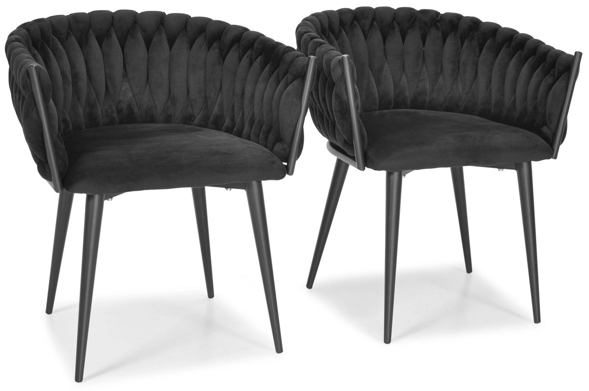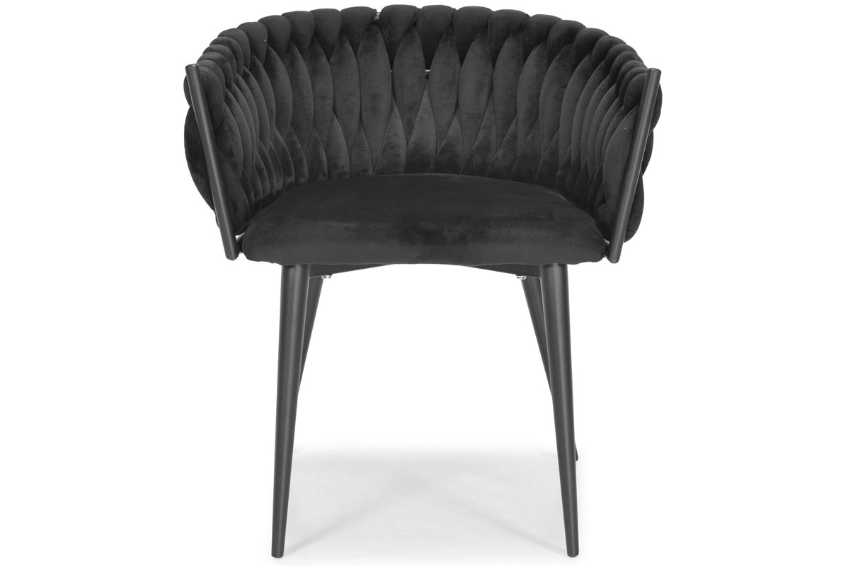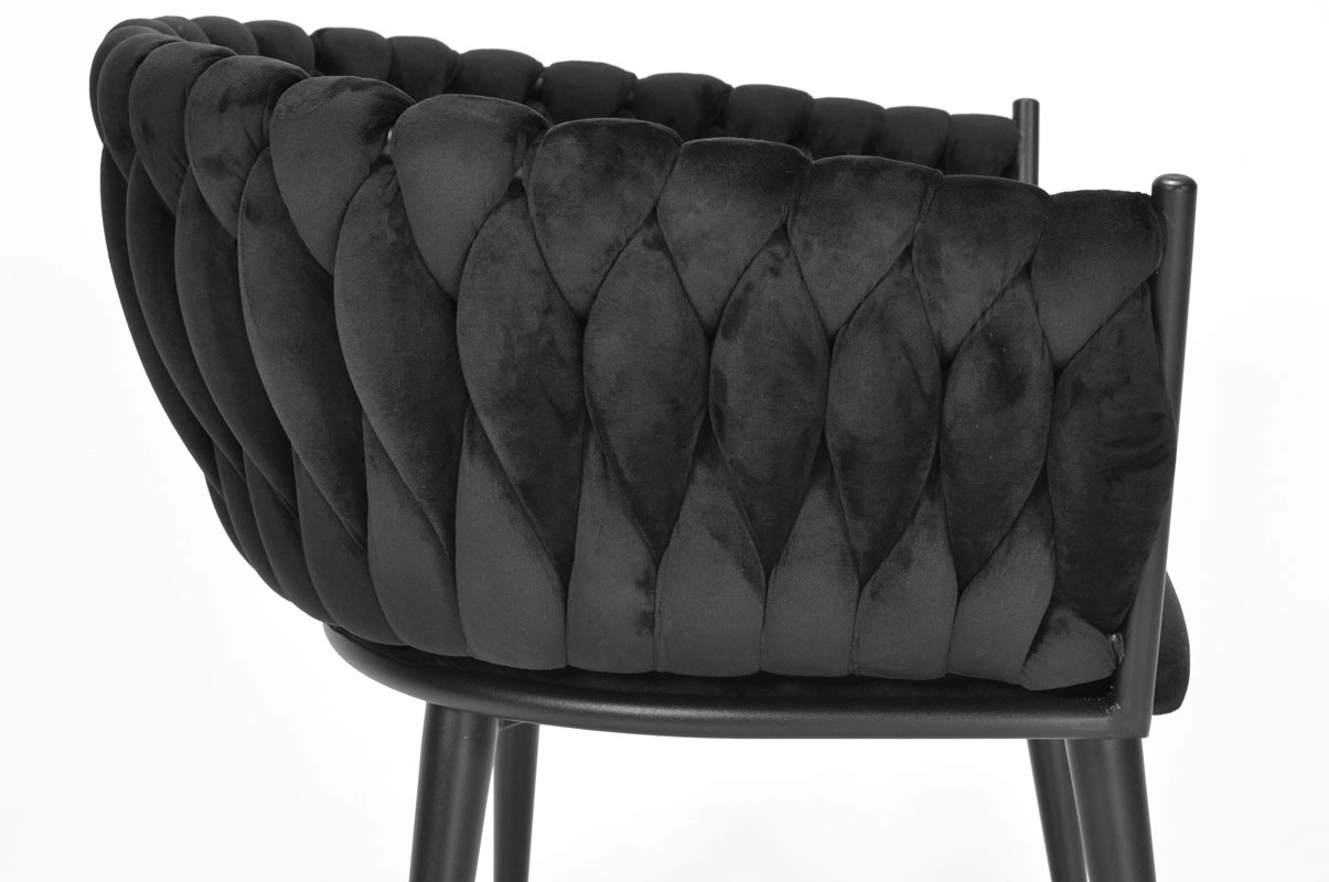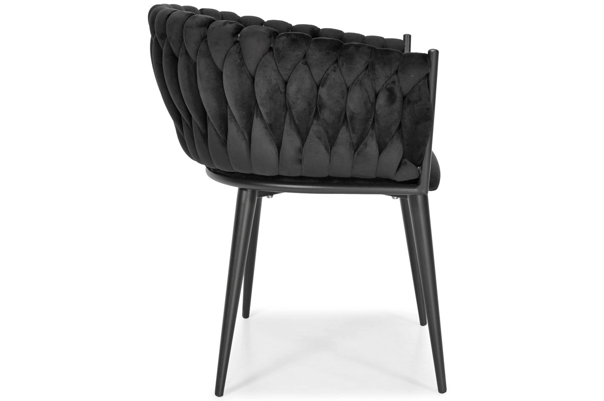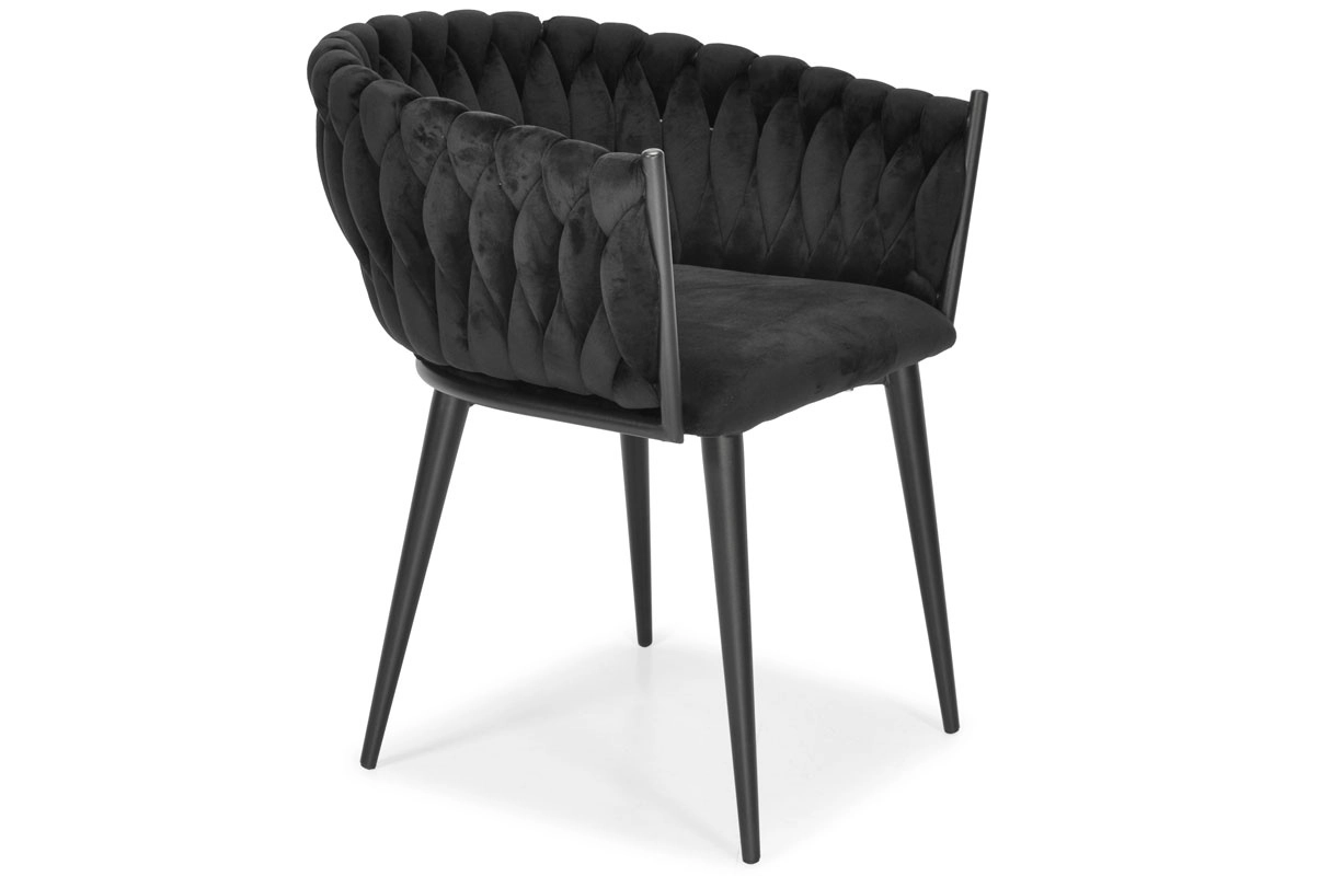 Elegancki fotel ROSA w głębokiej czerni łączy luksusowy aksamit, dekoracyjne, plecione oparcie oraz smukłe, stabilne nogi w stylowy akcent do salonu, jadalni i kącika beauty. Zapewnia wygodne, tapicerowane siedzisko i natychmiast dodaje wnętrzu efektu glamour oraz premium charakteru.