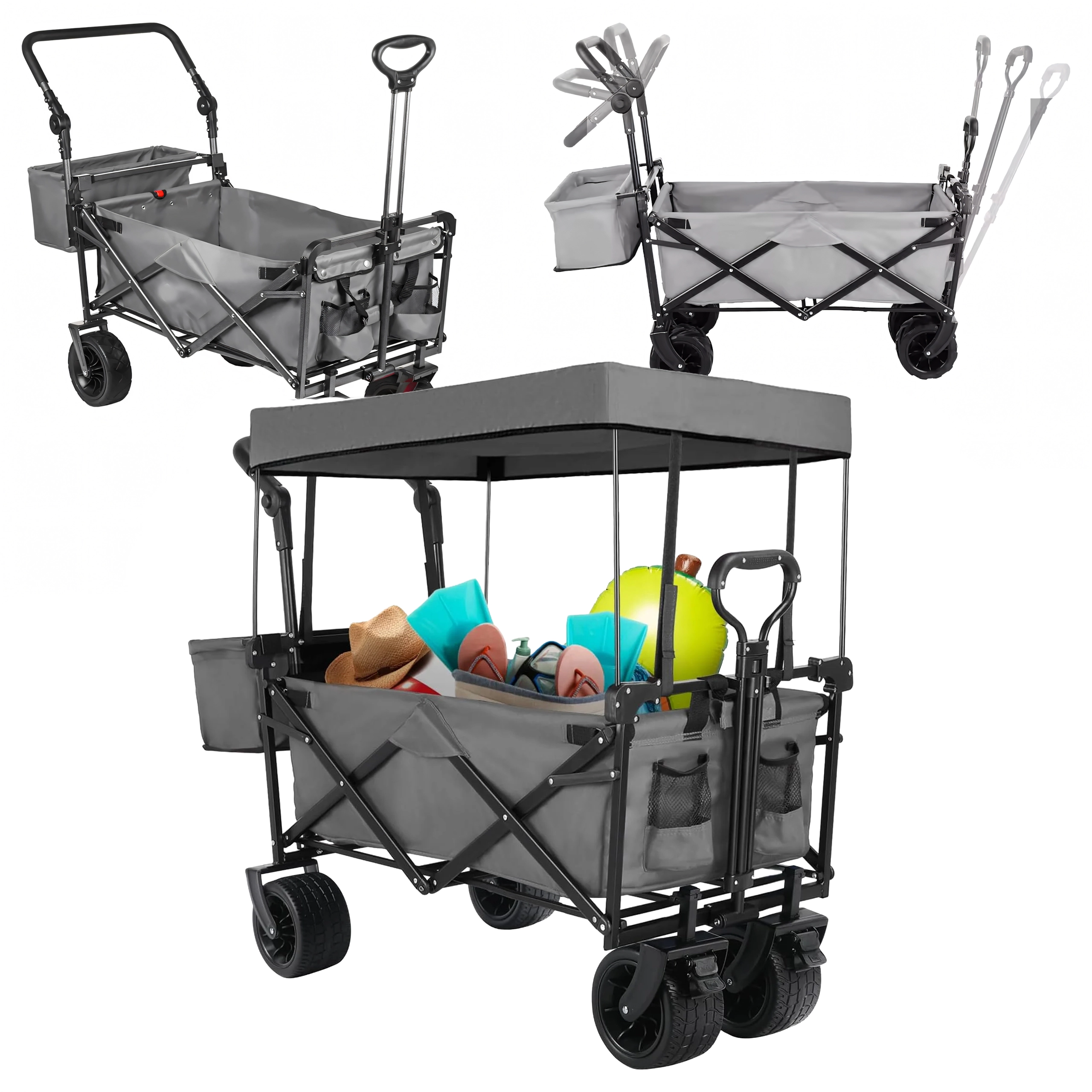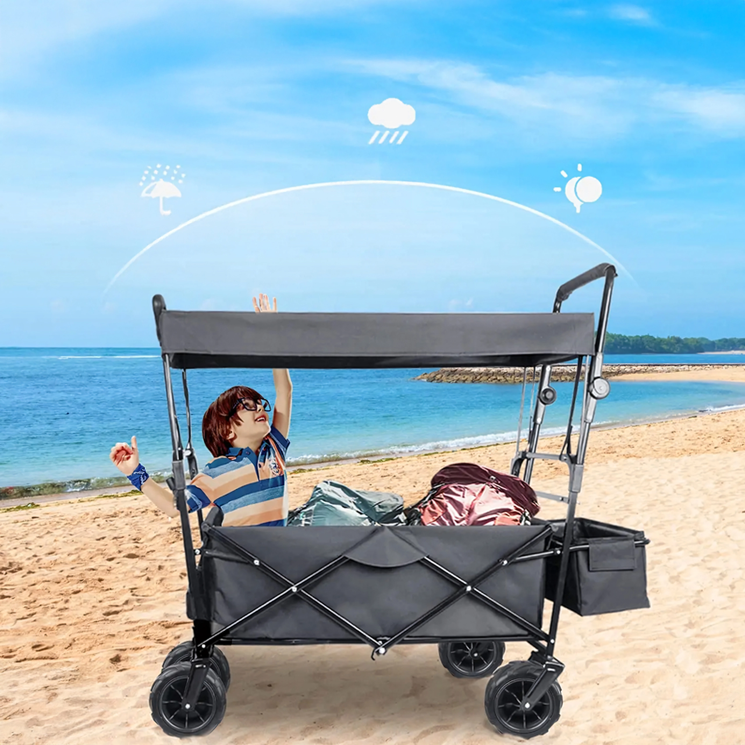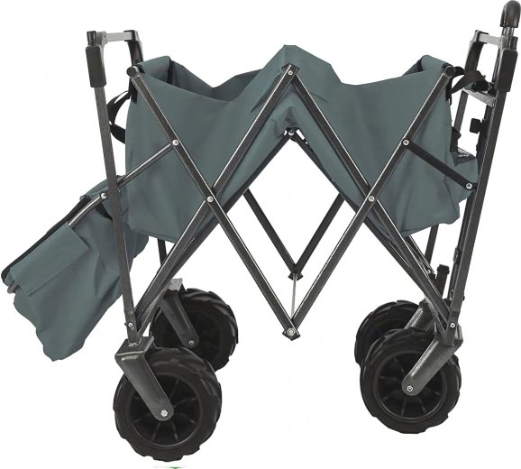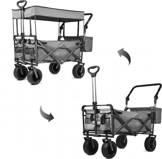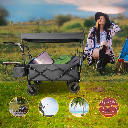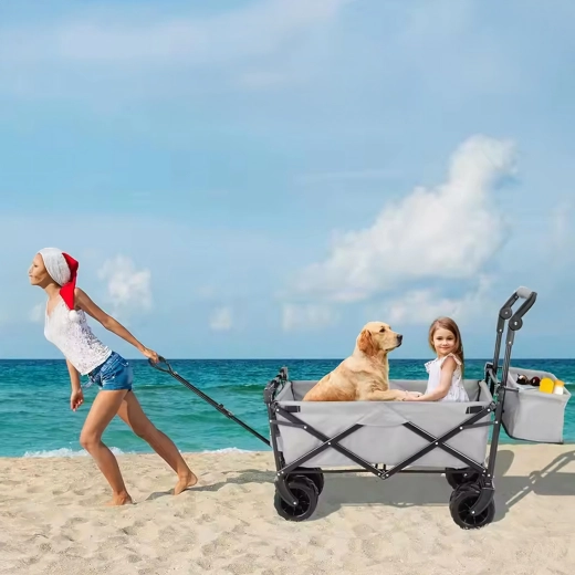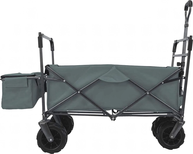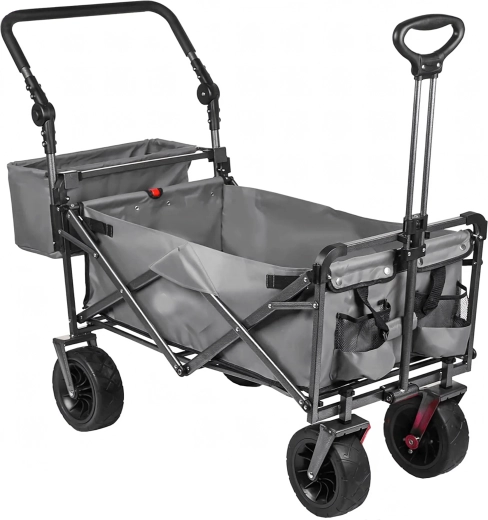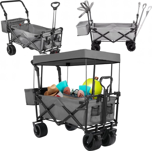Uniwersalny składany wózek to idealny pomocnik do ogrodu, na plażę, kemping i na ryby. Solidna konstrukcja z wytrzymałą tekstylną skrzynią bez trudu przewiezie narzędzia, zakupy, sprzęt sportowy i plażowe akcesoria. Dzięki kołom XL łatwo porusza się po piasku, trawie i żwirze, a daszek zapewnia cień i ochronę przed słońcem.