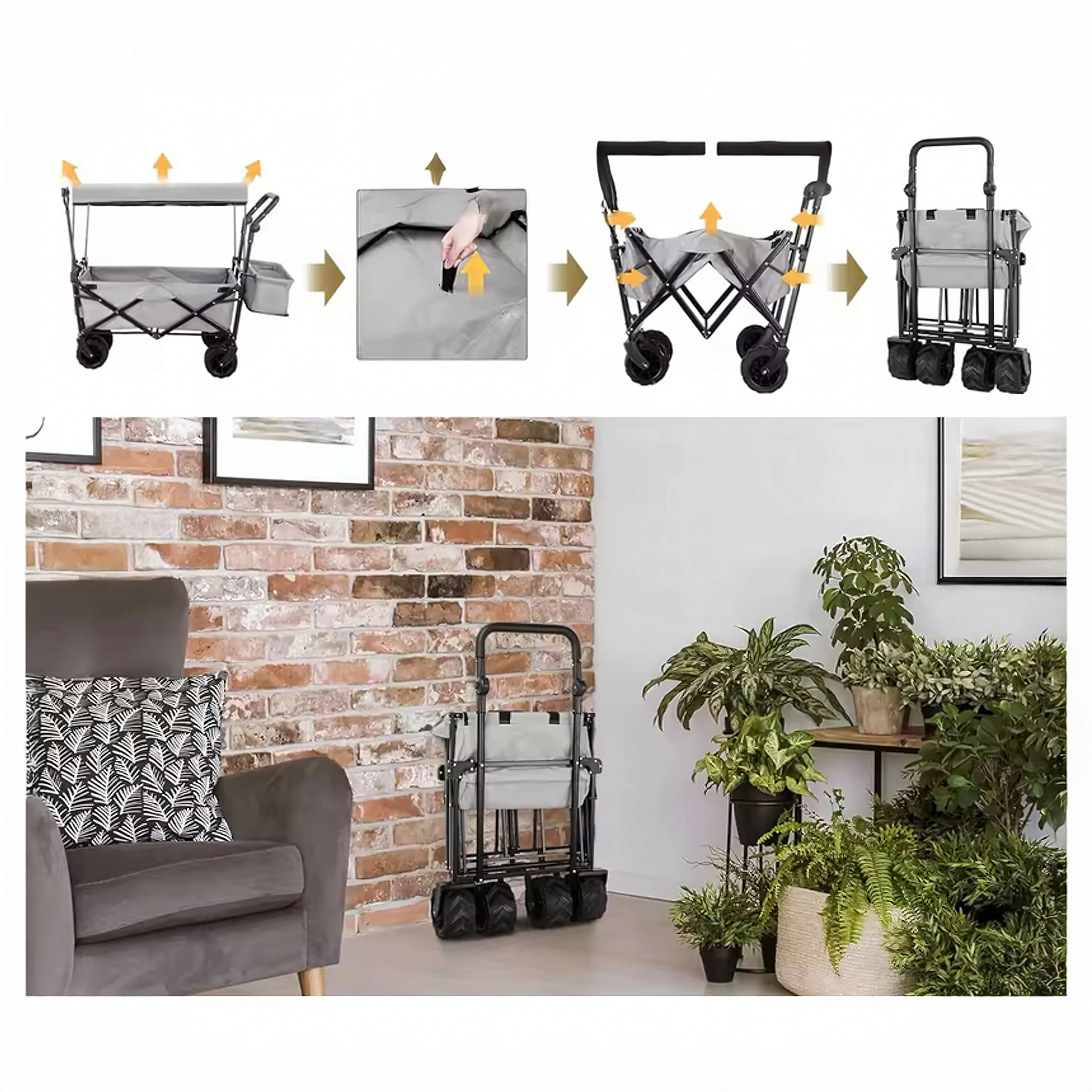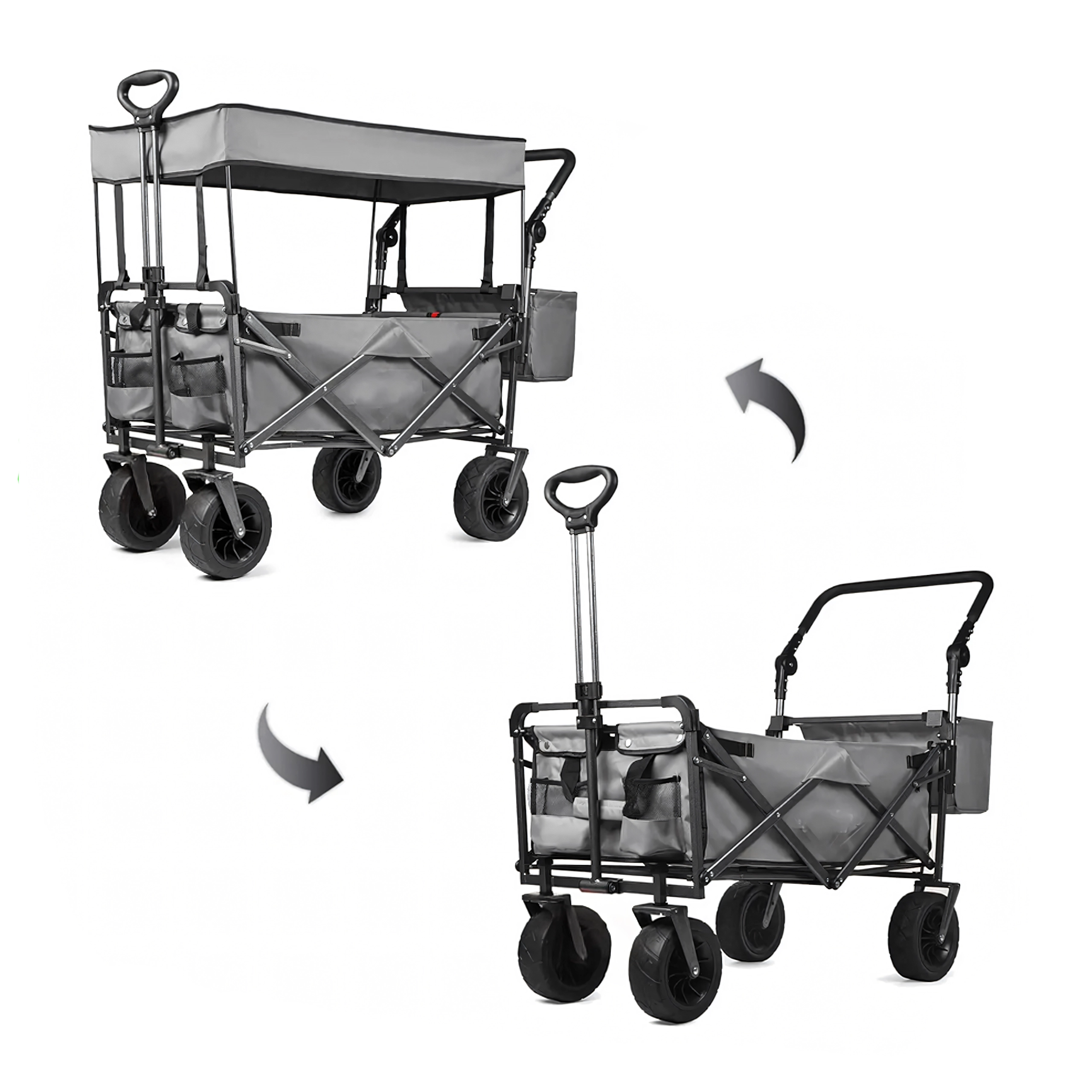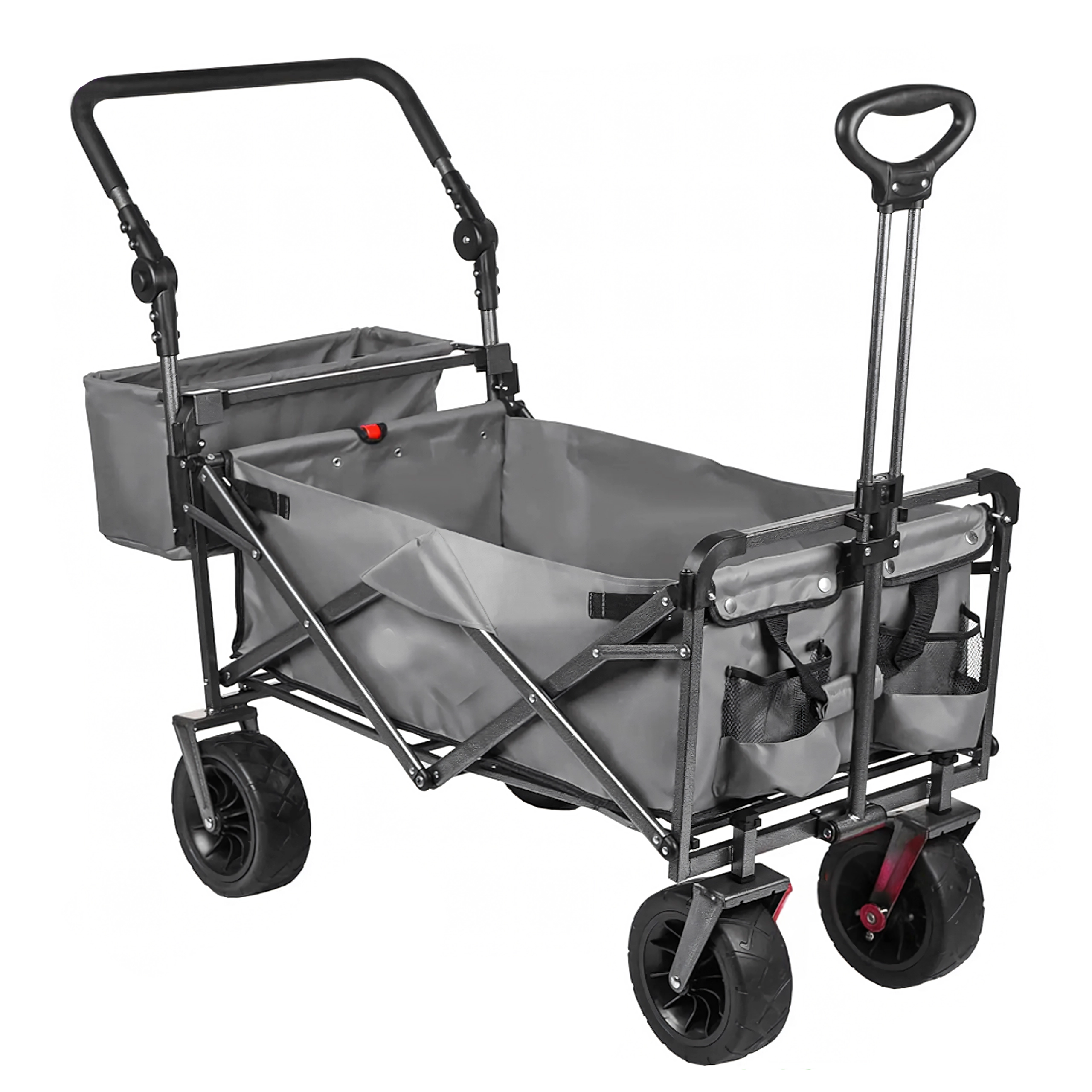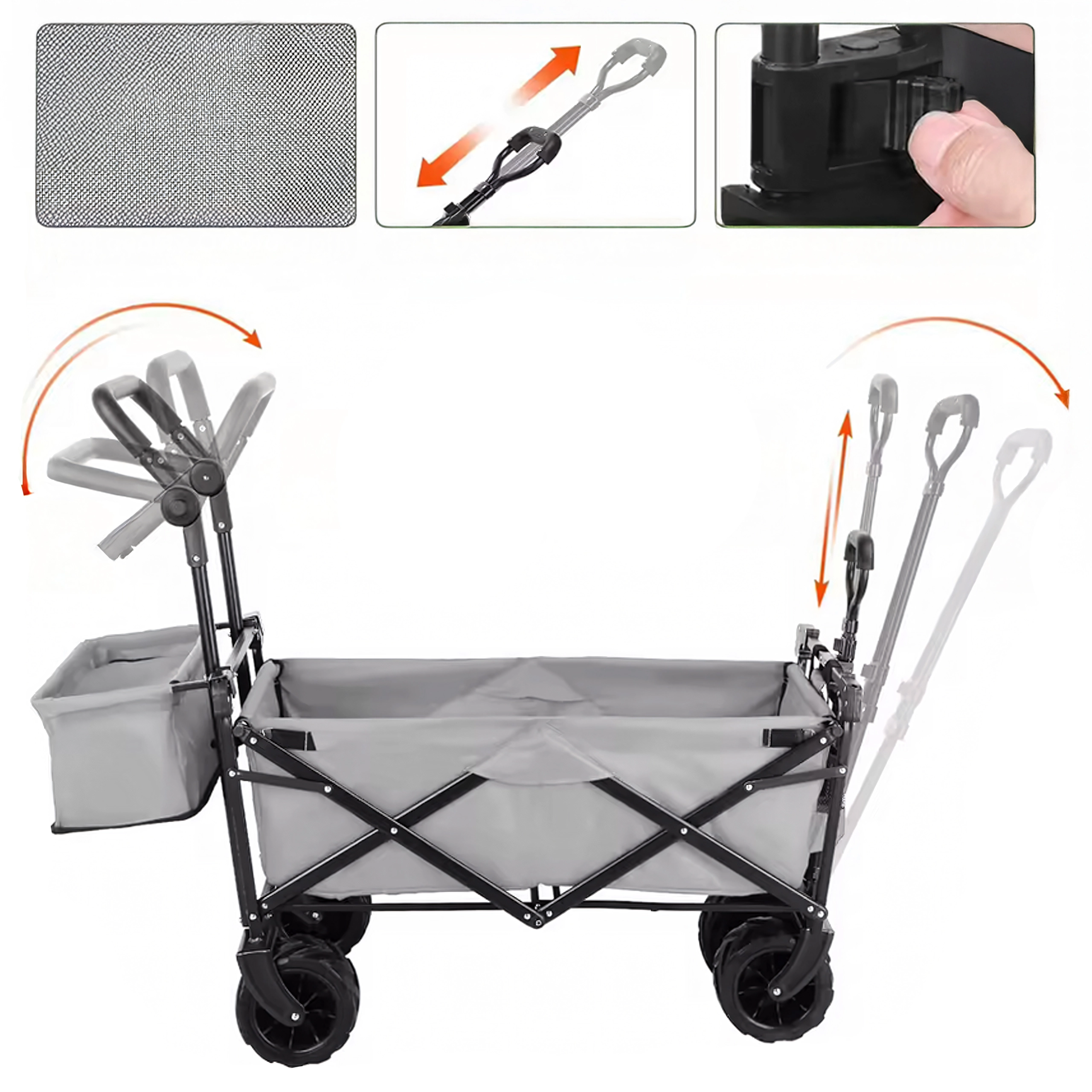 Uniwersalny składany wózek to idealny pomocnik do ogrodu, na plażę, kemping i na ryby. Solidna konstrukcja z wytrzymałą tekstylną skrzynią bez trudu przewiezie narzędzia, zakupy, sprzęt sportowy i plażowe akcesoria. Dzięki kołom XL łatwo porusza się po piasku, trawie i żwirze, a daszek zapewnia cień i ochronę przed słońcem.