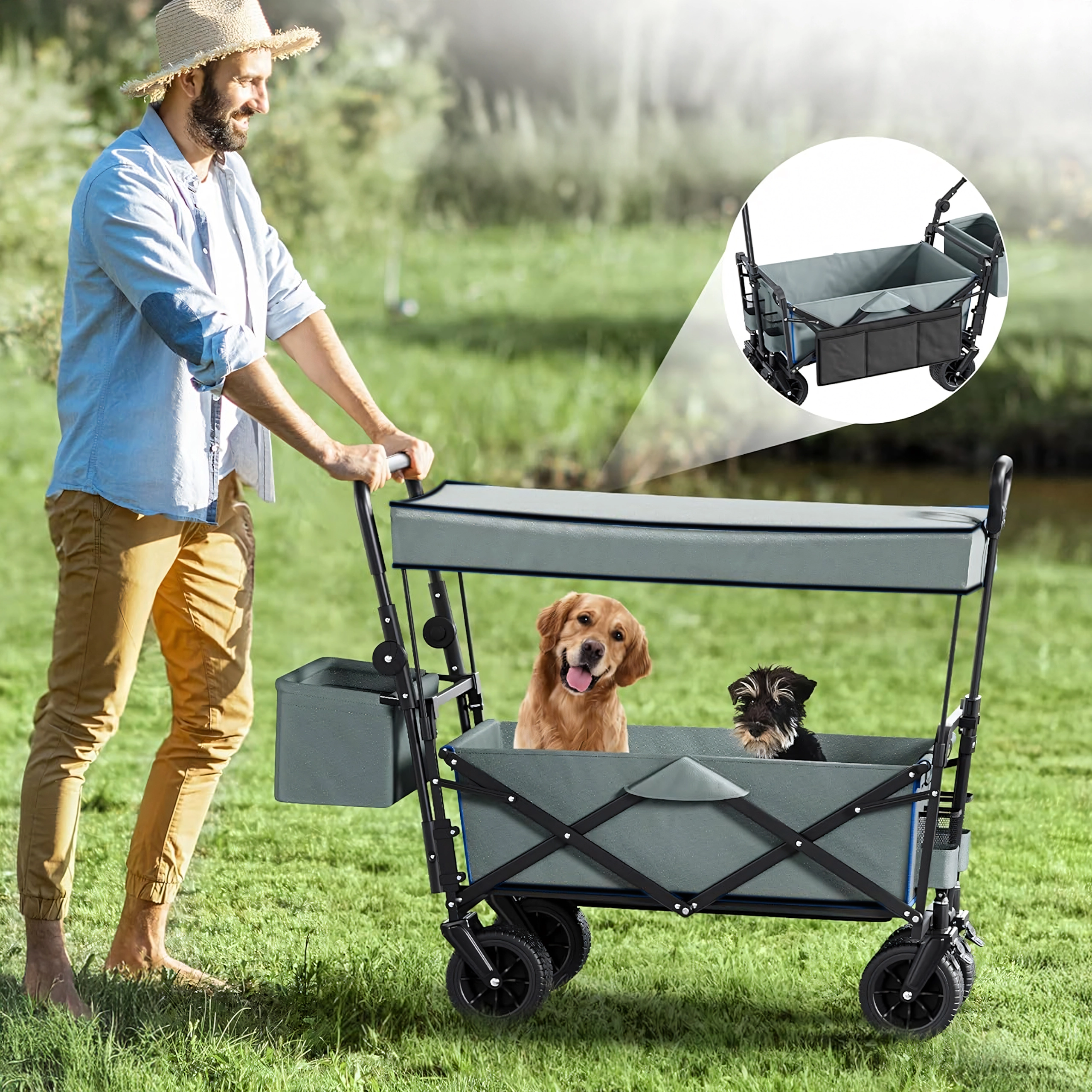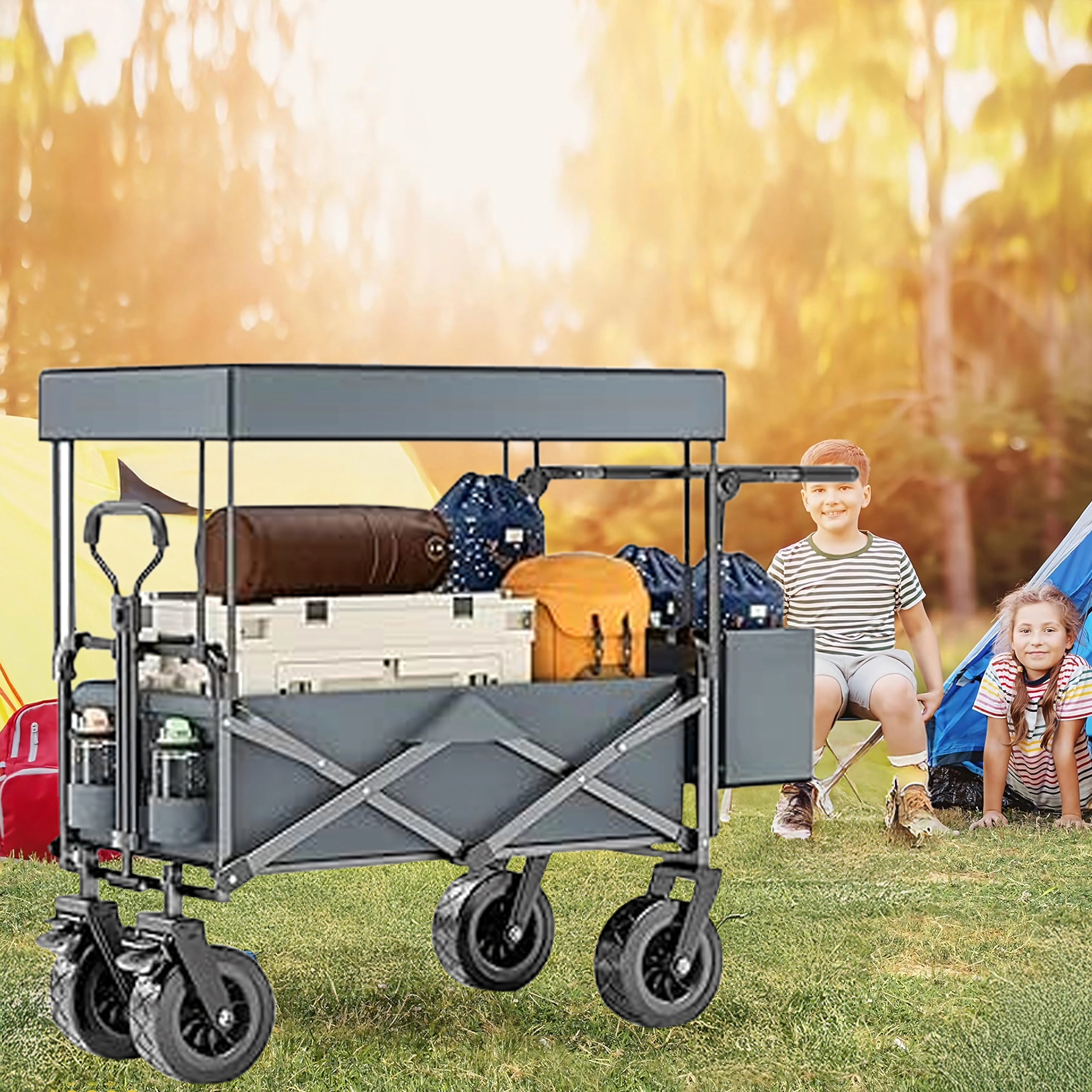 Odłączana kopuła chroni zawartość przed słońcem i lekkim wiatrem – praktyczne podczas przewożenia dzieci, zwierząt domowych i ekwipunku kempingowego.
