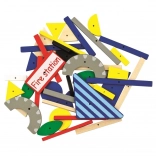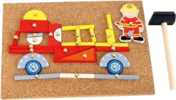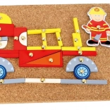 Kolorowe drewniane kształty i obrazki na korkowej podstawce pobudzają wyobraźnię i pozwalają układać wozy strażackie, remizy oraz całe scenki.