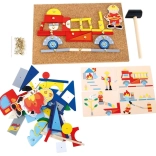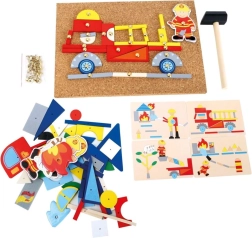 Ta kreatywna układanka z motywem strażackim zachwyci wszystkich małych budowniczych. Dzięki dużemu wyborowi kolorowych drewnianych kształtów dzieci mogą tworzyć wozy strażackie, remizy oraz własne historie. Proste przybijanie do korkowej podstawki jest intuicyjne i bezpieczne, a jednocześnie świetnie rozwija małą motorykę i koordynację oko–ręka.
