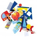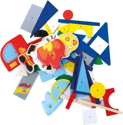 Zestaw zawiera korkową podkładkę, młotek, gwoździki i różnorodne drewniane kształty – wszystko do bezpiecznego i wielokrotnego układania.