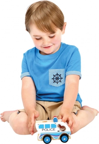 Wytrzymały drewniany policyjny samochodzik Bino ucieszy wszystkich małych stróżów prawa. Wykonany z wysokiej jakości drewna i elementów metalowych, ma gładkie krawędzie, wygodnie leży w dłoni i wspiera rozwój wyobraźni, motoryki małej oraz zabawę w odgrywanie ról. Świetnie uzupełni kolekcję z wozem strażackim i ambulansem z tej samej serii.