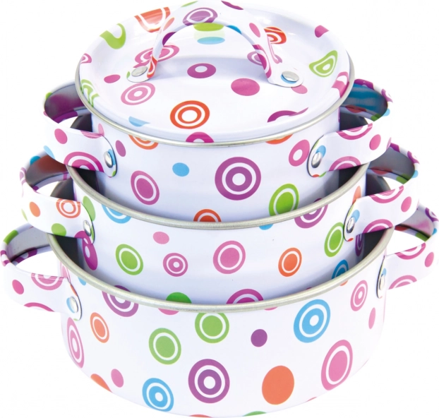 Stylowy dziecięcy zestaw metalowych naczyń dla małych kucharek i kucharzy zapewnia realistyczną zabawę w gotowanie w domu i na zewnątrz. Zawiera 3 garnki z pokrywkami, patelnię, chochlę, sito, łopatkę i rękawicę kuchenną. Trwałe wykonanie, kolorowy groszkowy wzór oraz 11 praktycznych elementów pobudzają wyobraźnię i rozwijają małą motorykę.