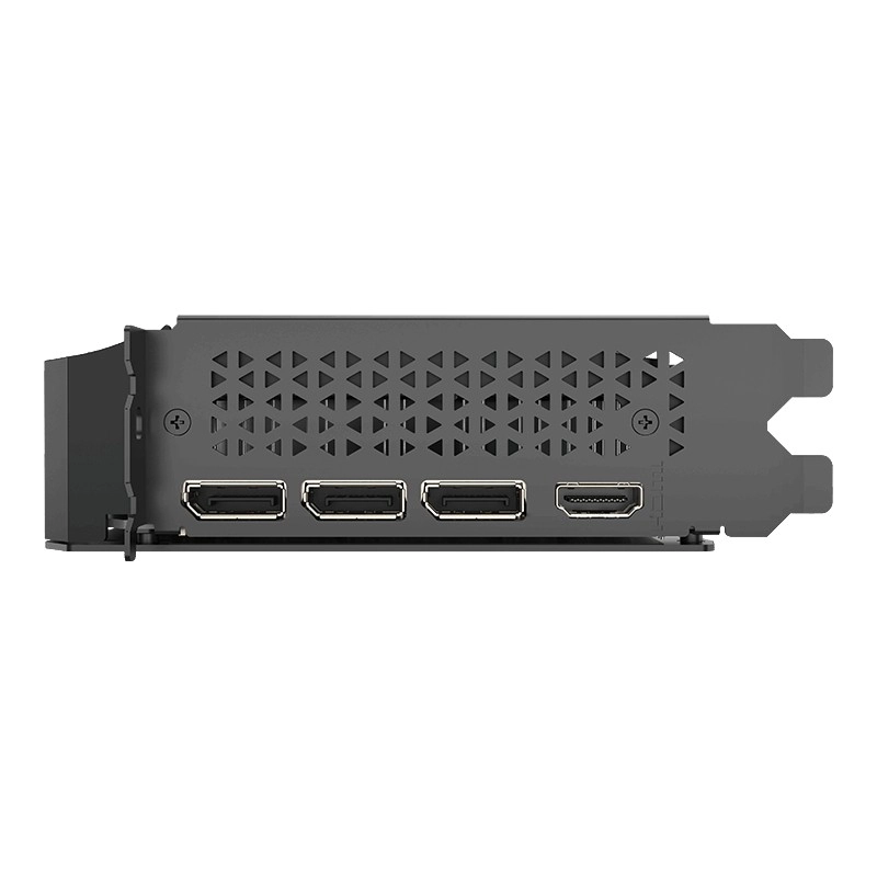 Krótkie, jedno- do dwuslotowego wykonanie z jednym dużym wentylatorem osiowym oraz solidnym metalowym backplate’em zwiększa sztywność karty i sprzyja lepszemu odprowadzaniu ciepła. Na tylnym panelu znajdziesz HDMI oraz trzy DisplayPorty dla wielu monitorów i płynnego multitaskingu.