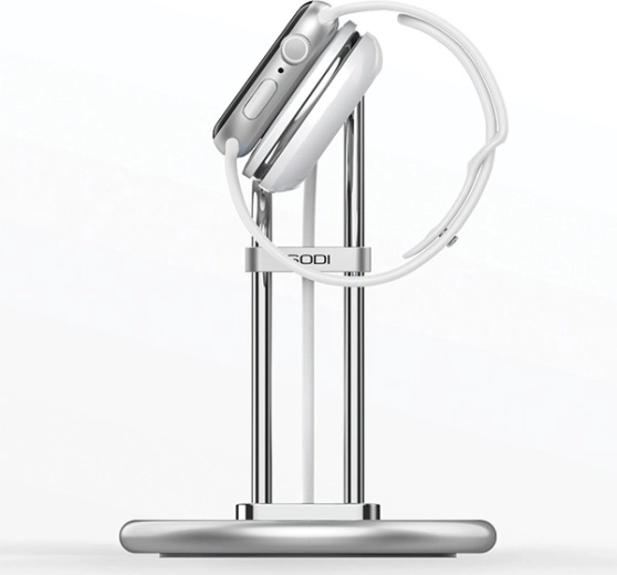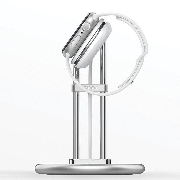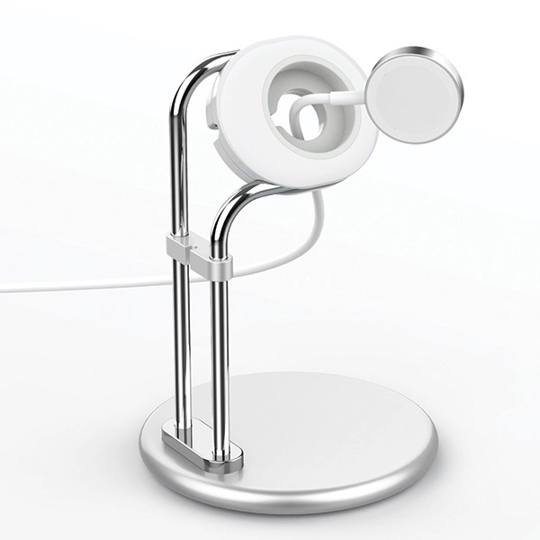 Masivne metalowe korpus z dociążoną podstawą trzyma zegarek pewnie na miejscu. Minimalistyczne, polerowane rurki i precyzyjny otwór na moduł ładowarki zapewniają bezpieczne i jednocześnie eleganckie ładowanie.