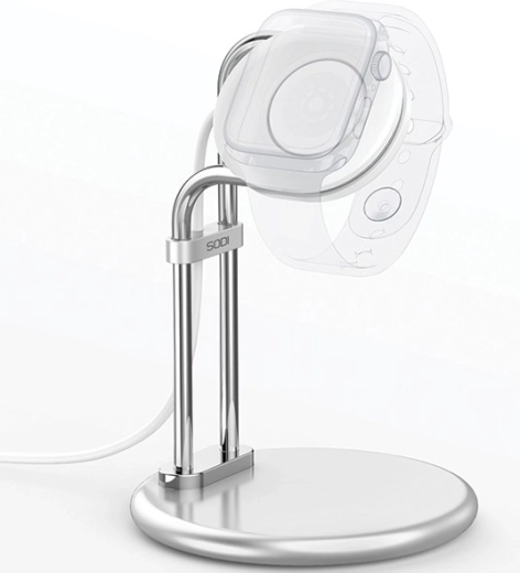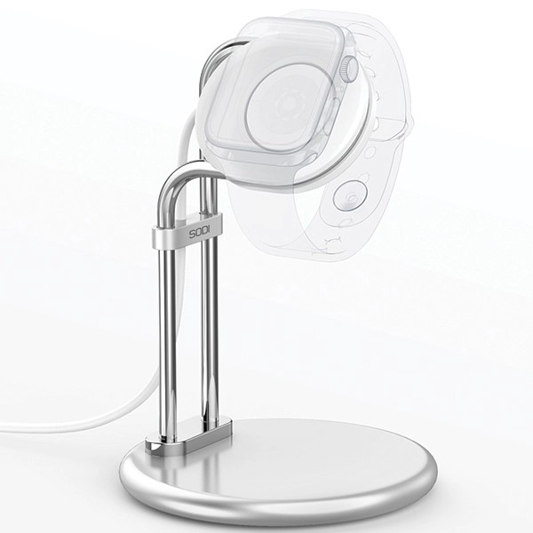Maksymalizuj przejrzystość na biurku i szafce nocnej. Ta premium podstawka do Apple Watch łączy precyzyjną aluminiową stopę ze stabilną dociążoną podstawą, a zegarek pozostaje bezpieczny podczas ładowania i ekspozycji. Kąt 55° zapewnia świetną widoczność czasu, powiadomień i trybu nocnego.