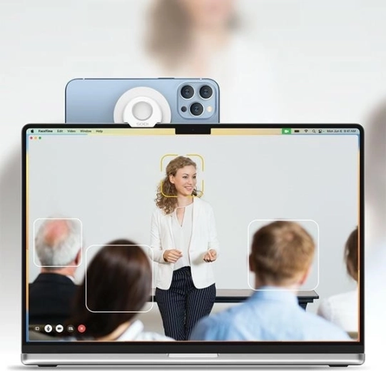 Umieść iPhone’a nad ekranem i wykorzystaj jego tylny aparat do ostrych i stabilnych wideorozmów, prezentacji oraz nagrywania obrazu.