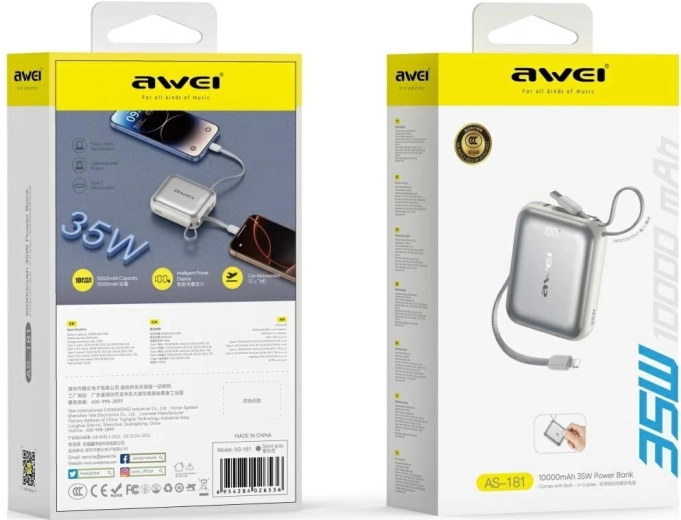 Stylowa i funkcjonalna powerbanka AWEI AS-181 to idealny wybór do codziennego użytku i podróżowania. Dzięki pojemności 10 000 mAh niezawodnie doładuje nowoczesne smartfony, tablety i akcesoria. Moc do 35 W skraca czas ładowania – w praktyce szybko uzupełnisz energię np. w iPhone 14 Pro, Xiaomi 13 Pro czy Samsungu S23. Zintegrowane przewody Lightning i USB‑C pełnią też rolę praktycznej pętli do wygodnego noszenia na nadgarstku lub przypięcia do torby.