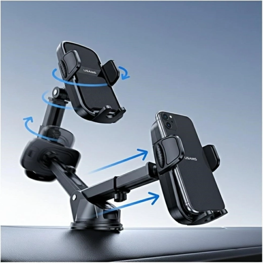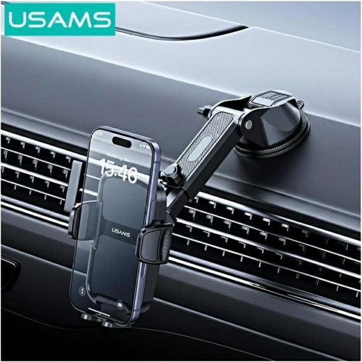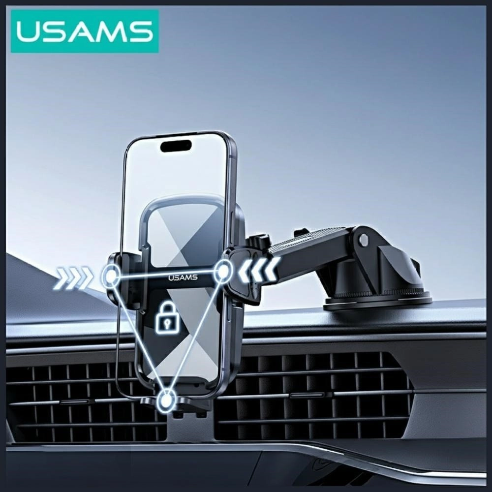 Praktyczny i stabilny uchwyt samochodowy USAMS do montażu na przedniej szybie lub desce rozdzielczej zapewnia bezpieczne mocowanie telefonu, mocną przyczepność dzięki silnej przyssawce oraz łatwą regulację kąta dla wygodnej nawigacji i rozmów w trybie głośnomówiącym.