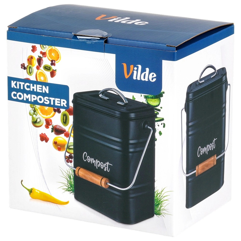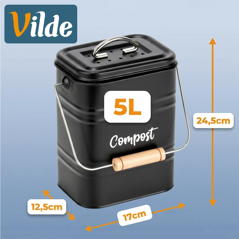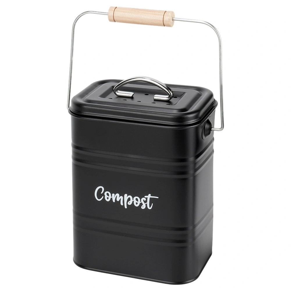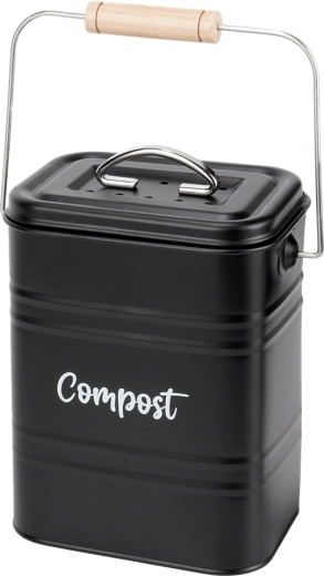 Solidna metalowa konstrukcja w eleganckim czarnym kolorze z napisem „Compost” jest odporna na codzienne użytkowanie. Zdejmowana pokrywa z otworami wentylacyjnymi ogranicza dostęp owadów, a wygodne uchwyty do przenoszenia z drewnianym chwytem ułatwiają manipulację.