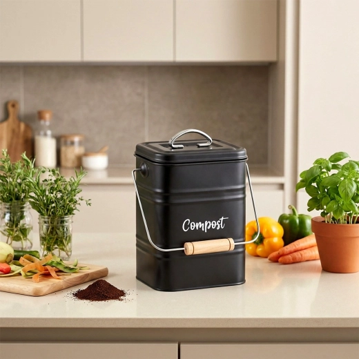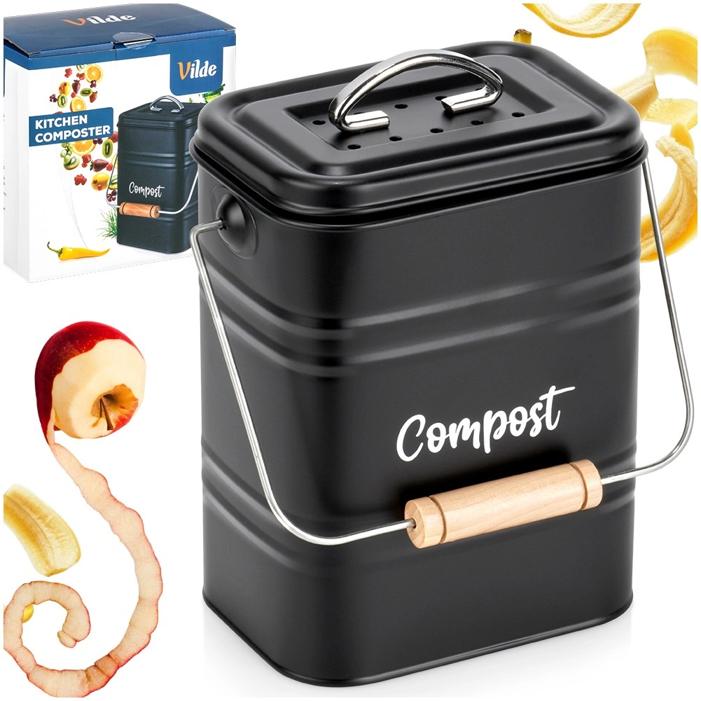 Metalowy kuchenny kompostownik o pojemności 5 litrów to praktyczne rozwiązanie do codziennego gromadzenia obierek, fusów kawowych i innych organicznych resztek. Pokrywa z wymiennym filtrem węglowym zapewnia skuteczną neutralizację zapachów, dzięki czemu pojemnik można bez obaw używać w pomieszczeniach.
