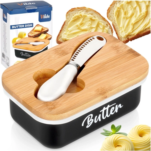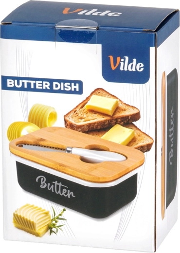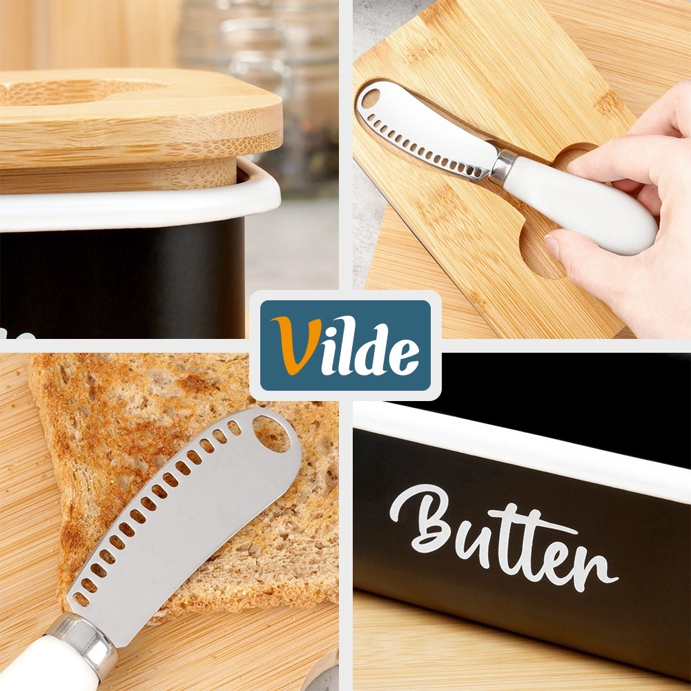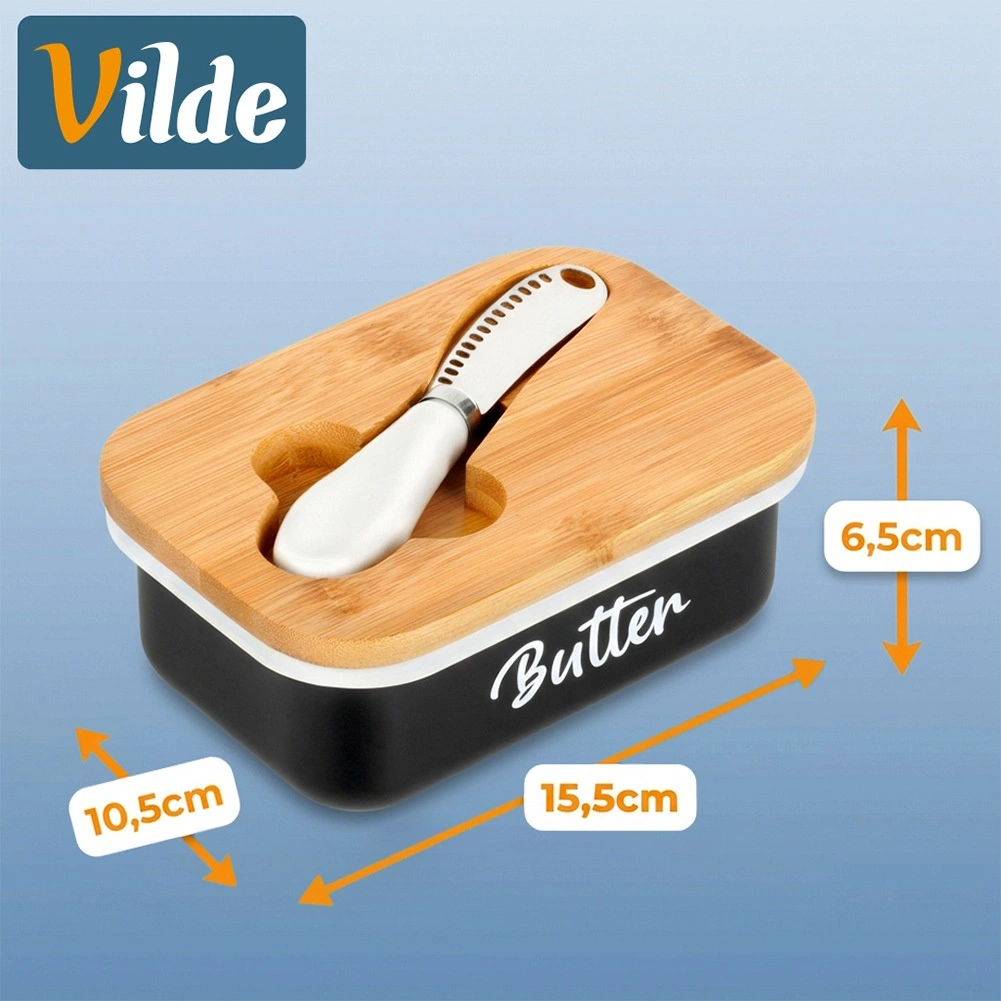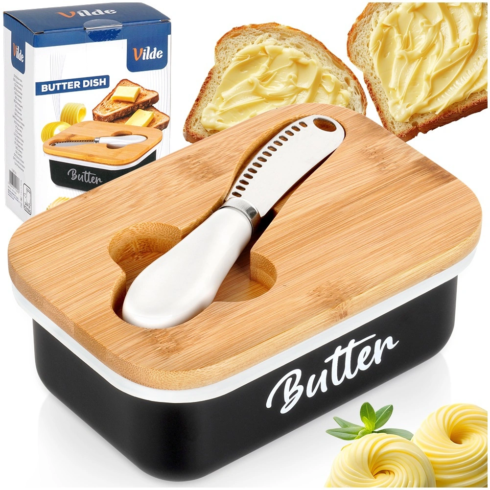 Elegancka maselniczka Vilde łączy nowoczesny wygląd z maksymalną praktycznością. Czarne metalowe korpus z białym napisem Butter uzupełnia naturalna bambusowa pokrywka, która pomaga utrzymać masło dłużej świeże i chronione. Zintegrowane wyfrezowanie w pokrywce skrywa dołączony nożyk, więc wszystko masz wygodnie pod ręką.